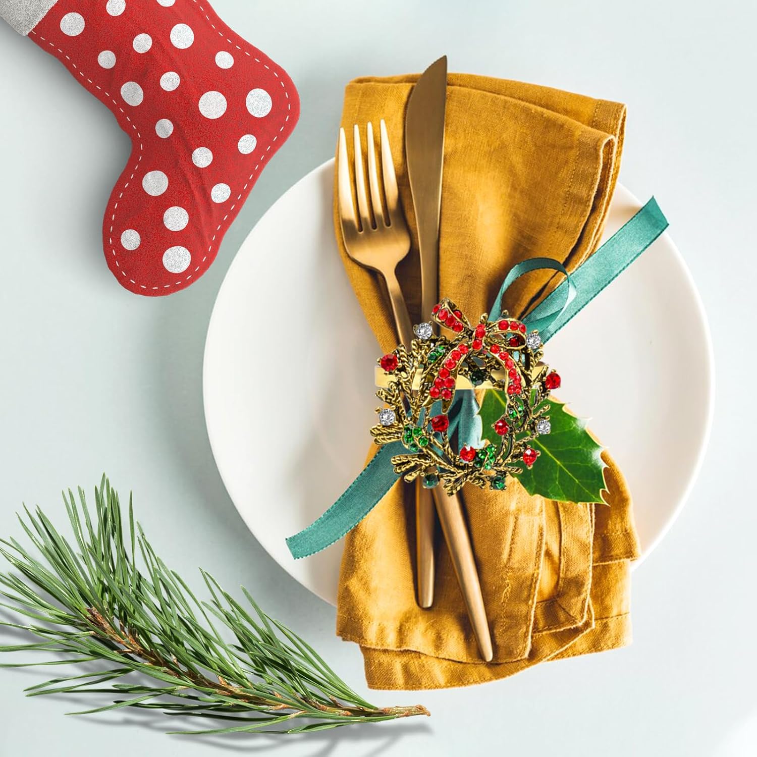 • Sturdy Material & Beautiful Design: These adorable Xmas napkin rings are made of metal which are sturdy and durable. Sparkling red, white, and green rhinestones are set in metal branches surrounding a bow encrusted with red rhinestones. They shine in the light and add an elegant splash of color to your table.