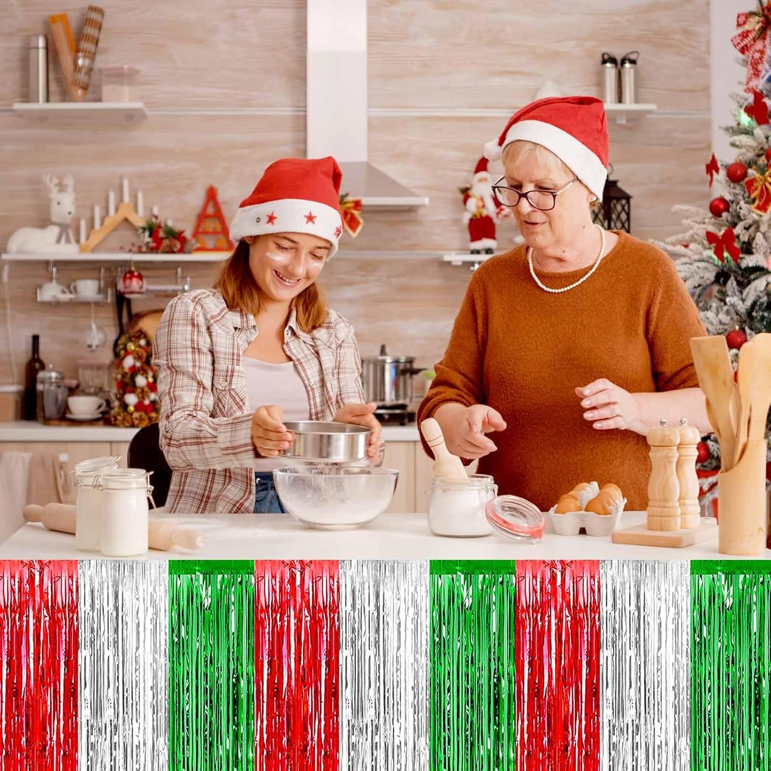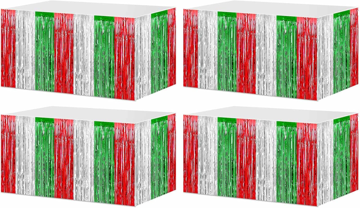 4 Pack 29x108 Inch Metallic Foil Fringe Tinsel Table Skirts for Rectangle Tables Streamer Backdrop for Wedding, Birthday, Parade Floats, Christmas, Halloween Party Decoration(Red Silver Green)
