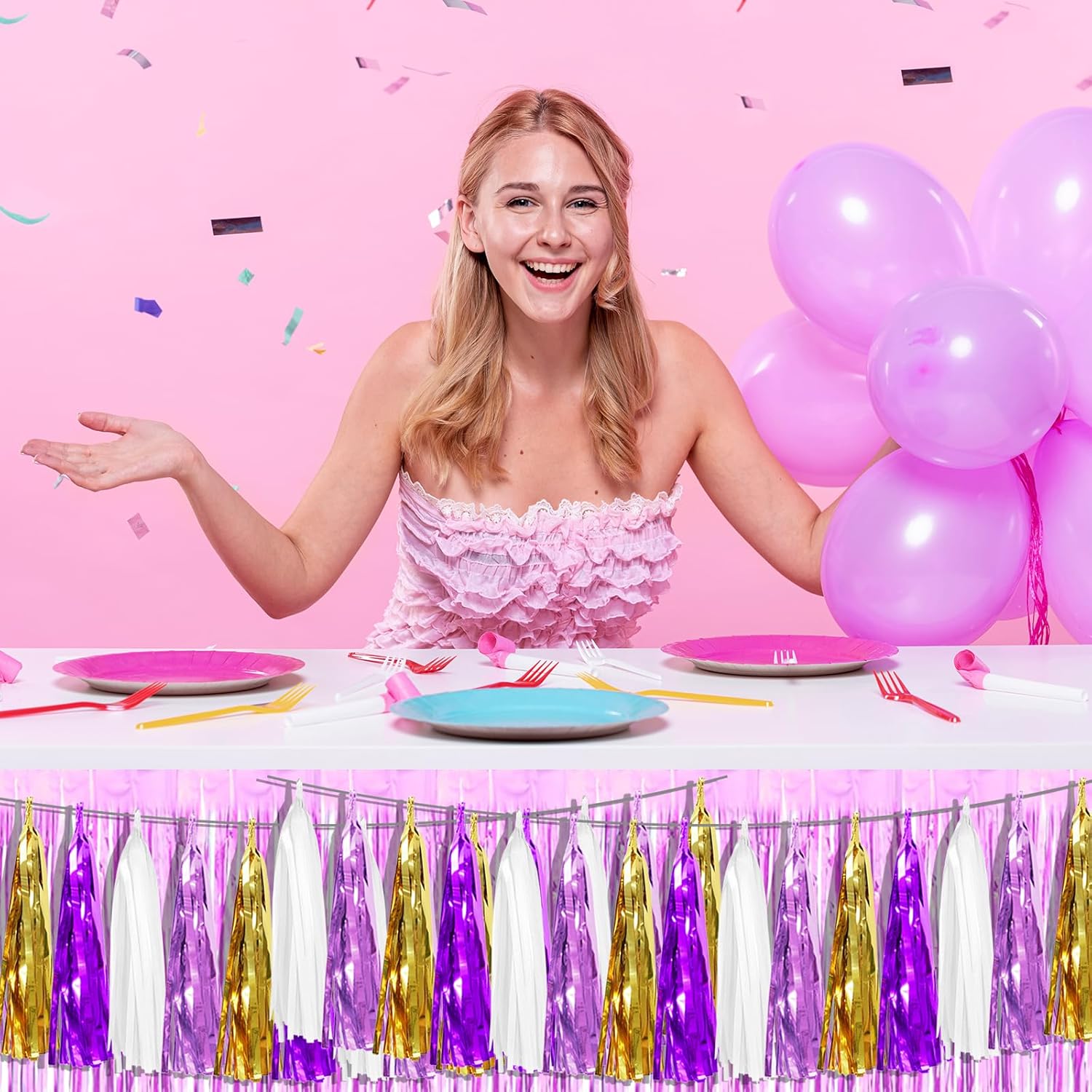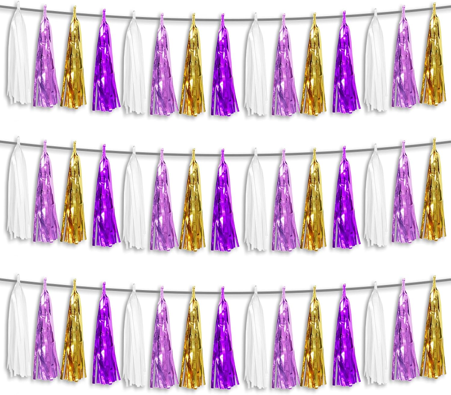 • 【White Light Purple Purple Gold Party Supplies Set】: The total length of the white light purple purple gold birthday tassels banner is 29.5 feet 45tassels, divided into 3 strips, each 9.8 feet long. Each banner contains 15 tassels, and each tassel measures 14 inches, for birthday decorations many occasions, and so on