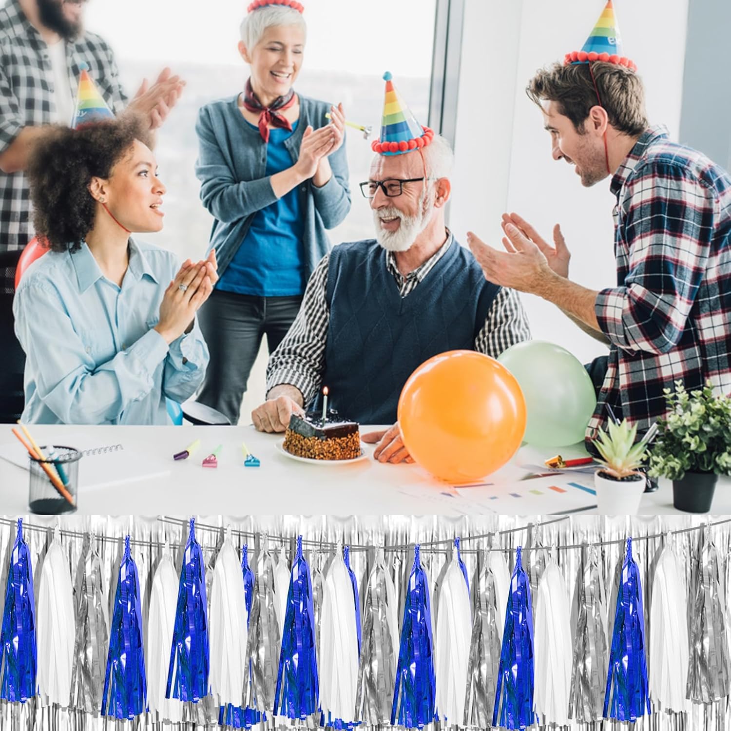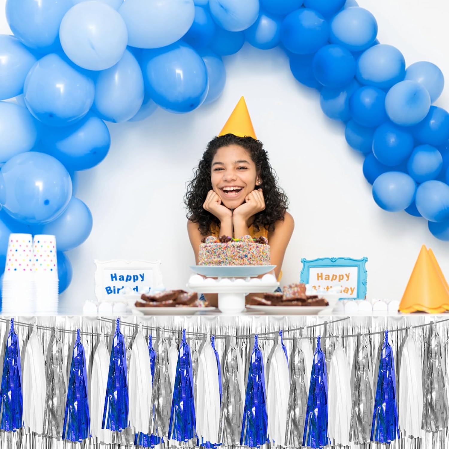 • 【Navy Blue White Silver Party Supplies Set】: The total length of the navy blue white silver birthday tassels banner is 29.5 feet 45tassels, divided into 3 strips, each 9.8 feet long. Each banner contains 15 tassels, and each tassel measures 14 inches, for birthday decorations many occasions, and so on