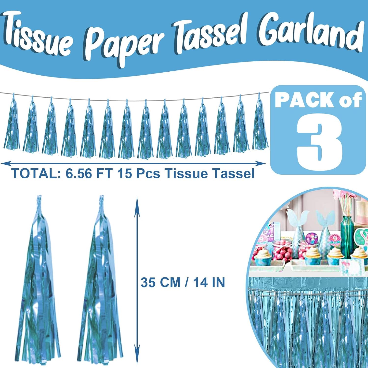 • 【Light Blue Party Supplies Set】: The total length of the light blue birthday tassels banner is 29.5 feet 45tassels, divided into 3 strips, each 9.8 feet long. Each banner contains 15 tassels, and each tassel measures 14 inches, for birthday decorations many occasions, and so on