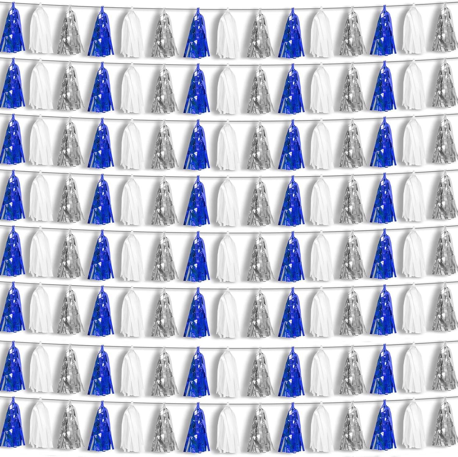 • 【Navy Blue White Silver Party Supplies Set】: The total length of the navy blue white silver birthday tassels banner is 78.7 feet 120tassels, divided into 8 strips, each 9.8 feet long. Each banner contains 15 tassels, and each tassel measures 14 inches, for birthday decorations many occasions, and so on