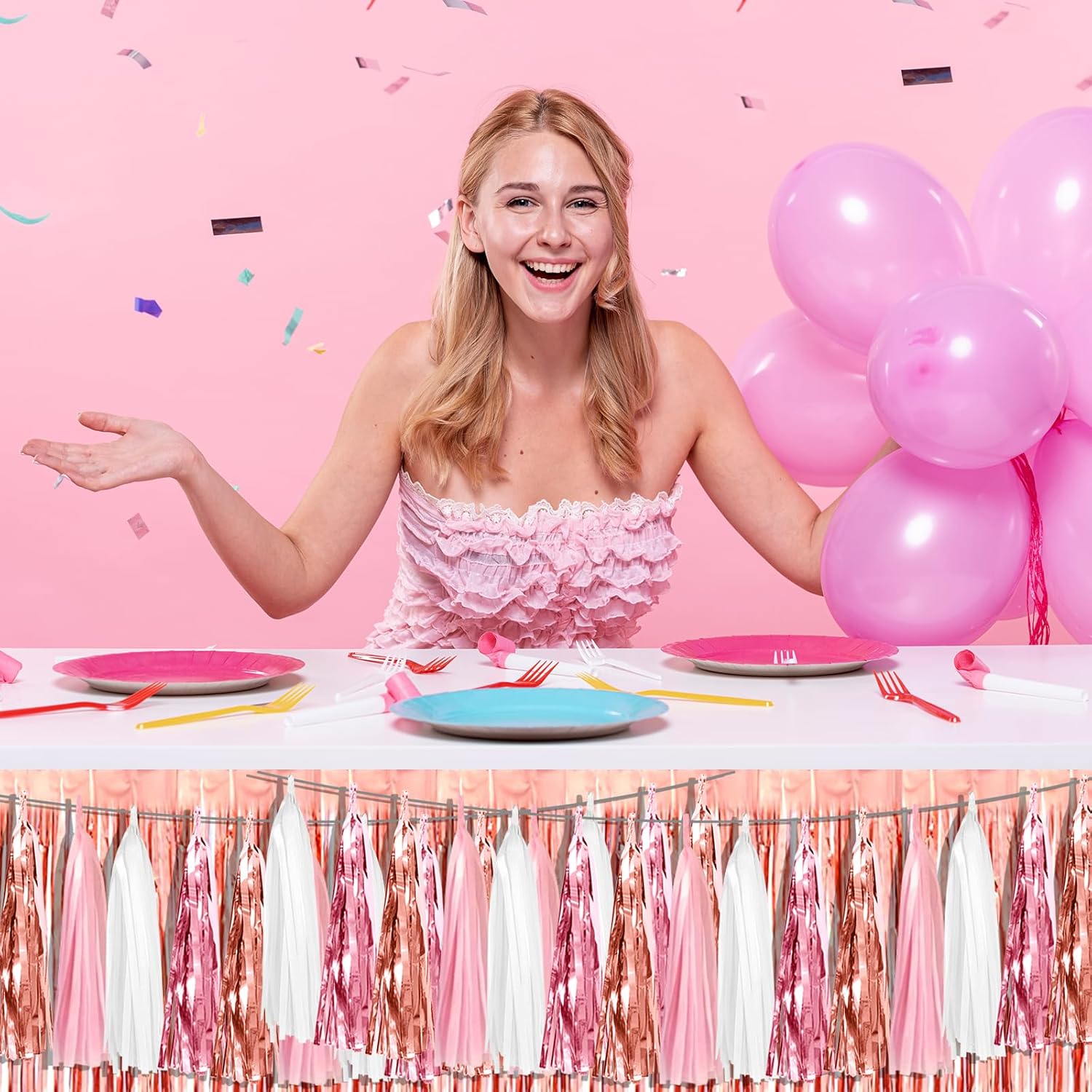 • 【Pink White Peach Rose Gold Party Supplies Set】: The total length of the pink white peach rose gold birthday tassels banner is 29.5 feet 45tassels, divided into 3 strips, each 9.8 feet long. Each banner contains 15 tassels, and each tassel measures 14 inches, for birthday decorations many occasions, and so on