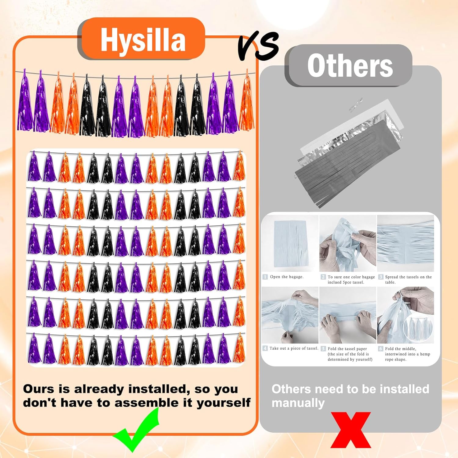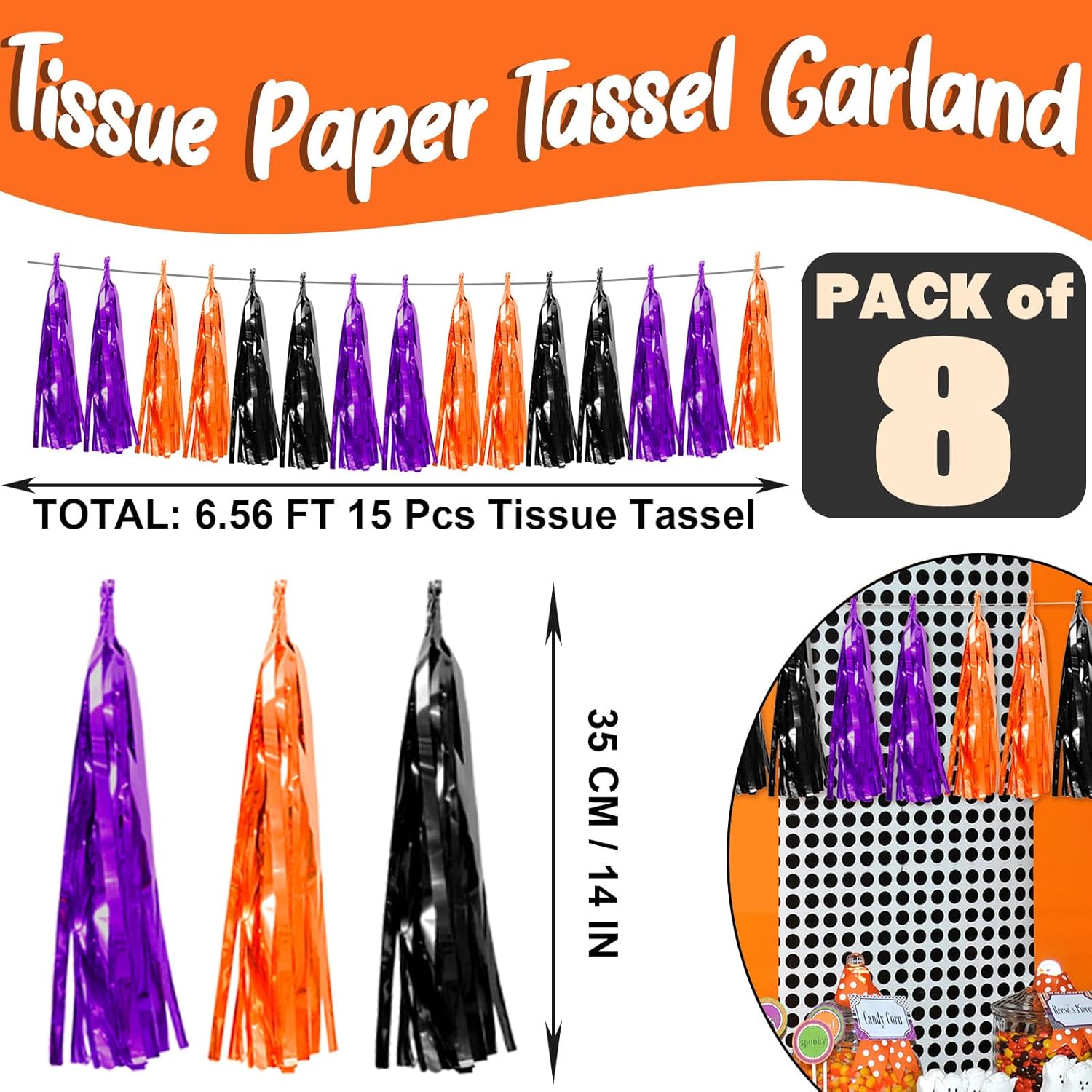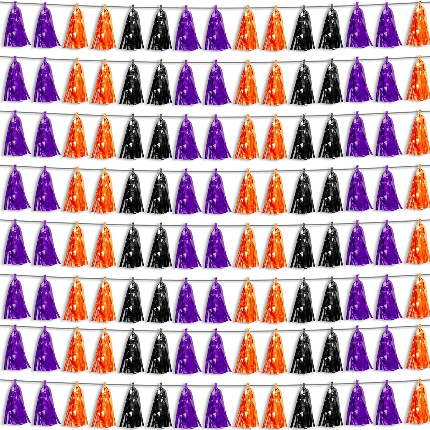• 【Purple Black 0range Party Supplies Set】: The total length of the Purple Black 0range birthday tassels banner is 78.7 feet 120tassels, divided into 8 strips, each 9.8 feet long. Each banner contains 15 tassels, and each tassel measures 14 inches, for birthday decorations many occasions, and so on