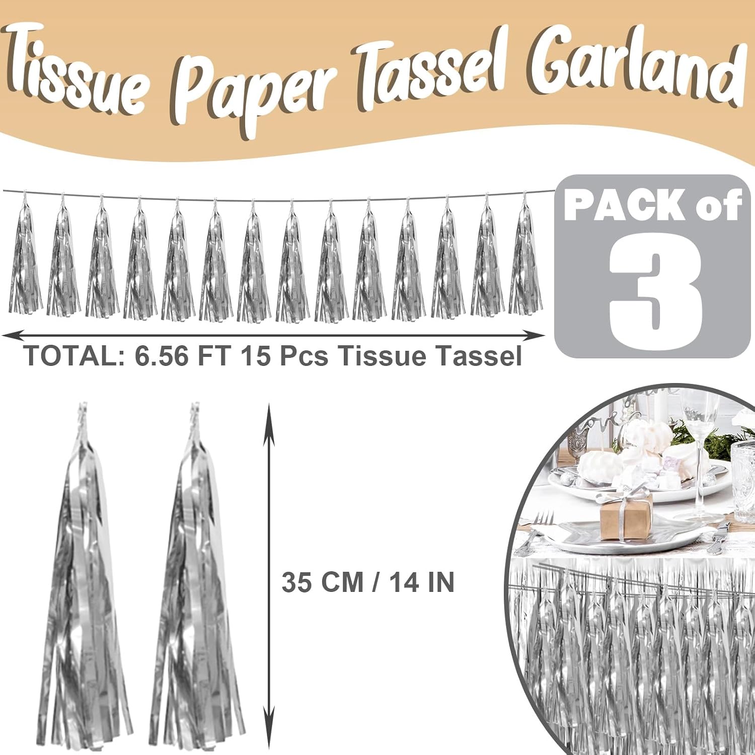 • 【Silver Party Supplies Set】: The total length of the silver birthday tassels banner is 29.5 feet 45tassels, divided into 3 strips, each 9.8 feet long. Each banner contains 15 tassels, and each tassel measures 14 inches, for birthday decorations many occasions, and so on
