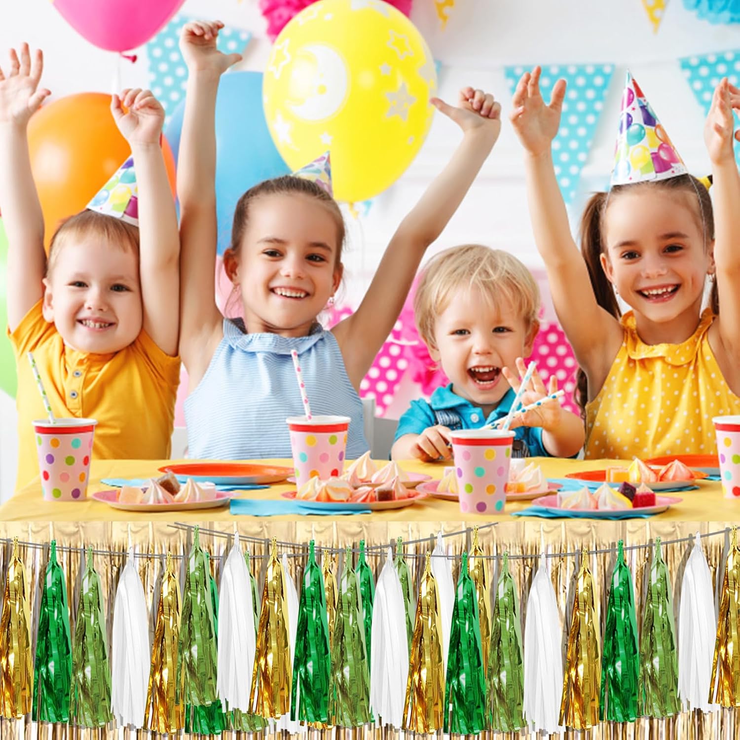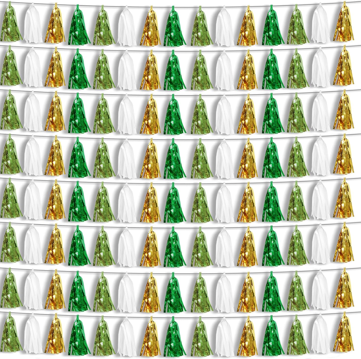 • 【Light Green White Gold Green Party Supplies Set】: The total length of the Light Green White Gold Green birthday tassels banner is 78.7 feet 120tassels, divided into 8 strips, each 9.8 feet long. Each banner contains 15 tassels, and each tassel measures 14 inches, for birthday decorations many occasions, and so on