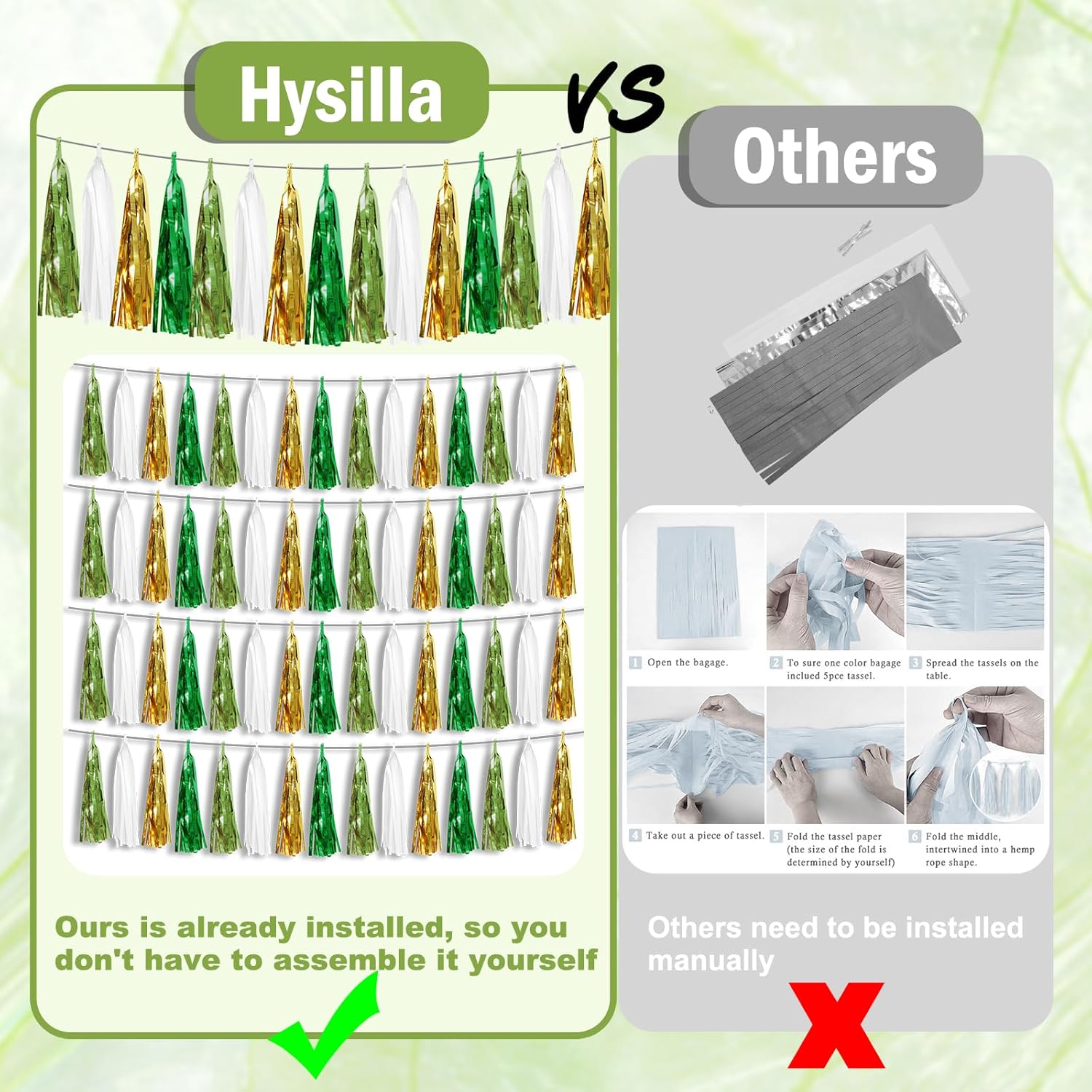 • 【Perfect Party Decoration】The Light Green White Gold Green tinsel garlands are designed in a metallic Fringe, bright, and beautiful, at the same time, they shine in the sun, and these gorgeous tassel garlands create a wonderful backdrop or centerpiece for your party space. and bring you, your family, and your friend's good Visual effects. your party many emotional and touching moments where a lot of pictures will be taken and everybody will have a wonderful time together.