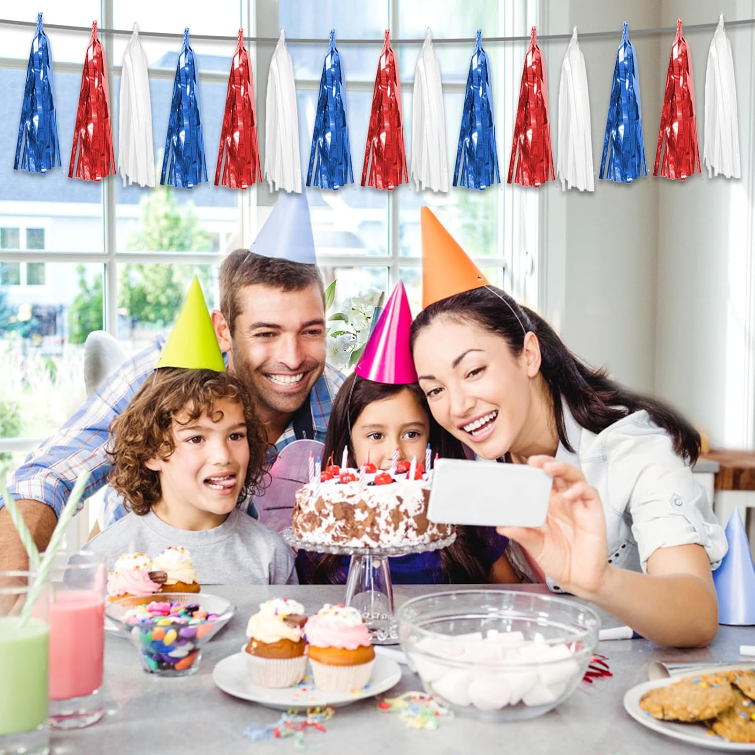 • 【Perfect Party Decoration】The Red Bule White tinsel garlands are designed in a metallic Fringe, bright, and beautiful, at the same time, they shine in the sun, and these gorgeous tassel garlands create a wonderful backdrop or centerpiece for your party space. and bring you, your family, and your friend's good Visual effects. your party many emotional and touching moments where a lot of pictures will be taken and everybody will have a wonderful time together.