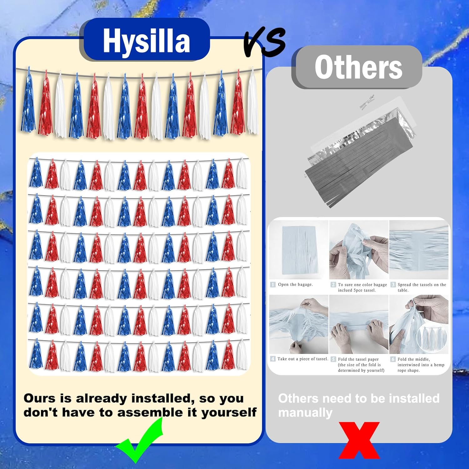 • 【Red Blue White Party Supplies Set】: The total length of the Red Bule White birthday tassels banner is 29.5 feet 45tassels, divided into 3 strips, each 9.8 feet long. Each banner contains 15 tassels, and each tassel measures 14 inches, for birthday decorations many occasions, and so on
