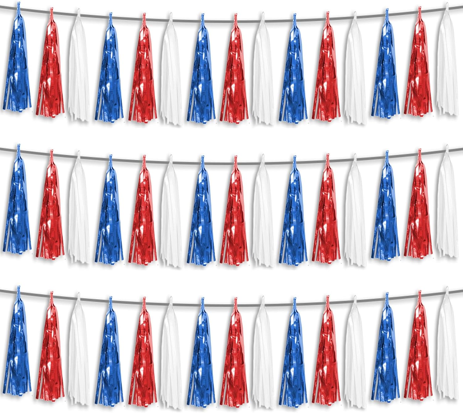 3P Red Blue White Foil Fringe Metallic Tassel Streamers Banner Tassel Garland for Parade Floats, Bachelorette, Wedding, Birthday, Halloween, Christmas, Bridal/Baby Shower Party Decorations