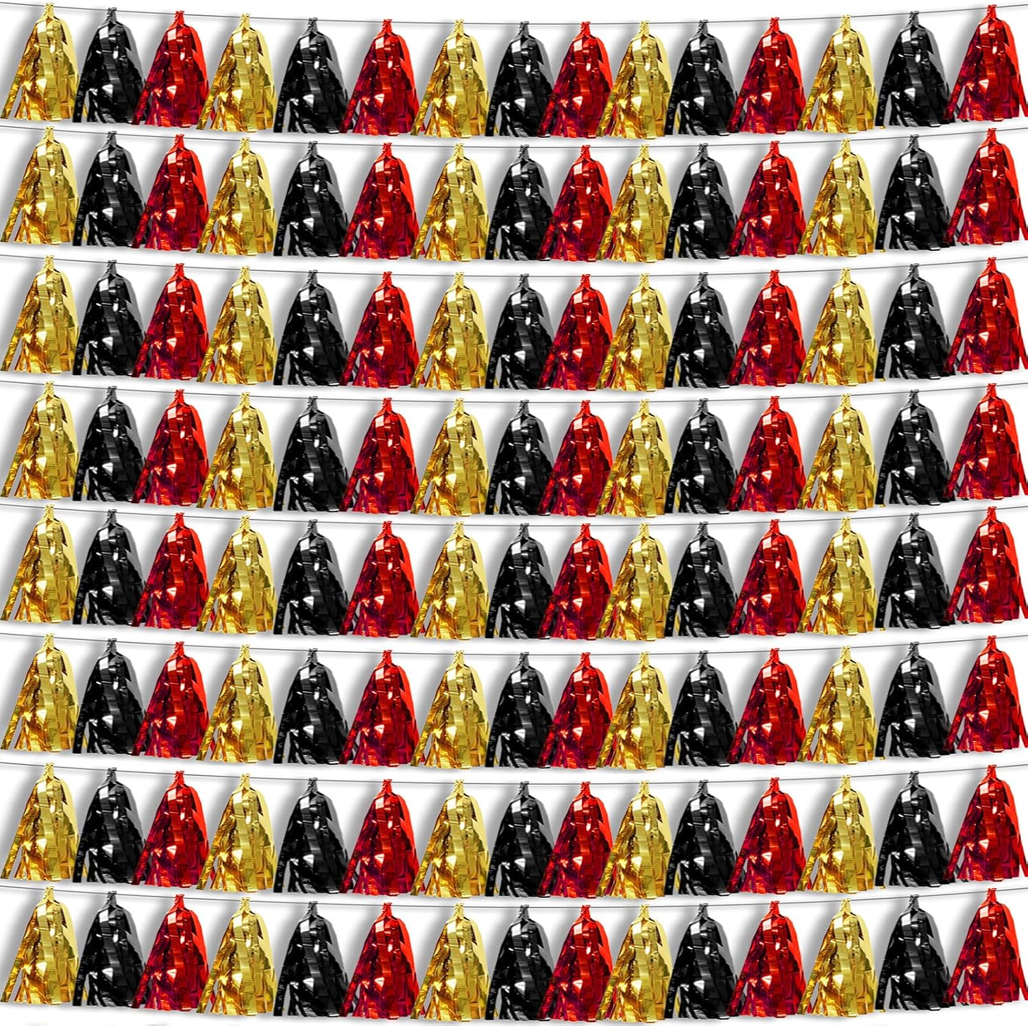 • 【Black Red Gold Party Supplies Set】: The total length of the black red gold birthday tassels banner is 78.7 feet 120tassels, divided into 8 strips, each 9.8 feet long. Each banner contains 15 tassels, and each tassel measures 14 inches, for birthday decorations many occasions, and so on