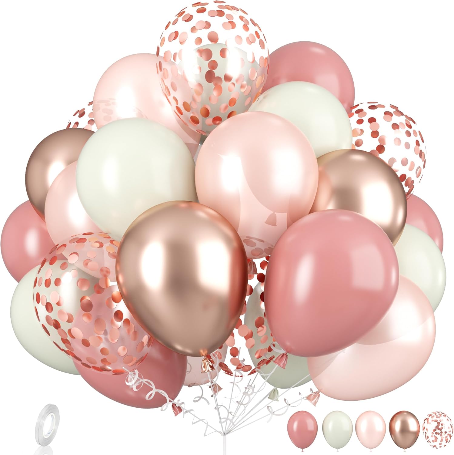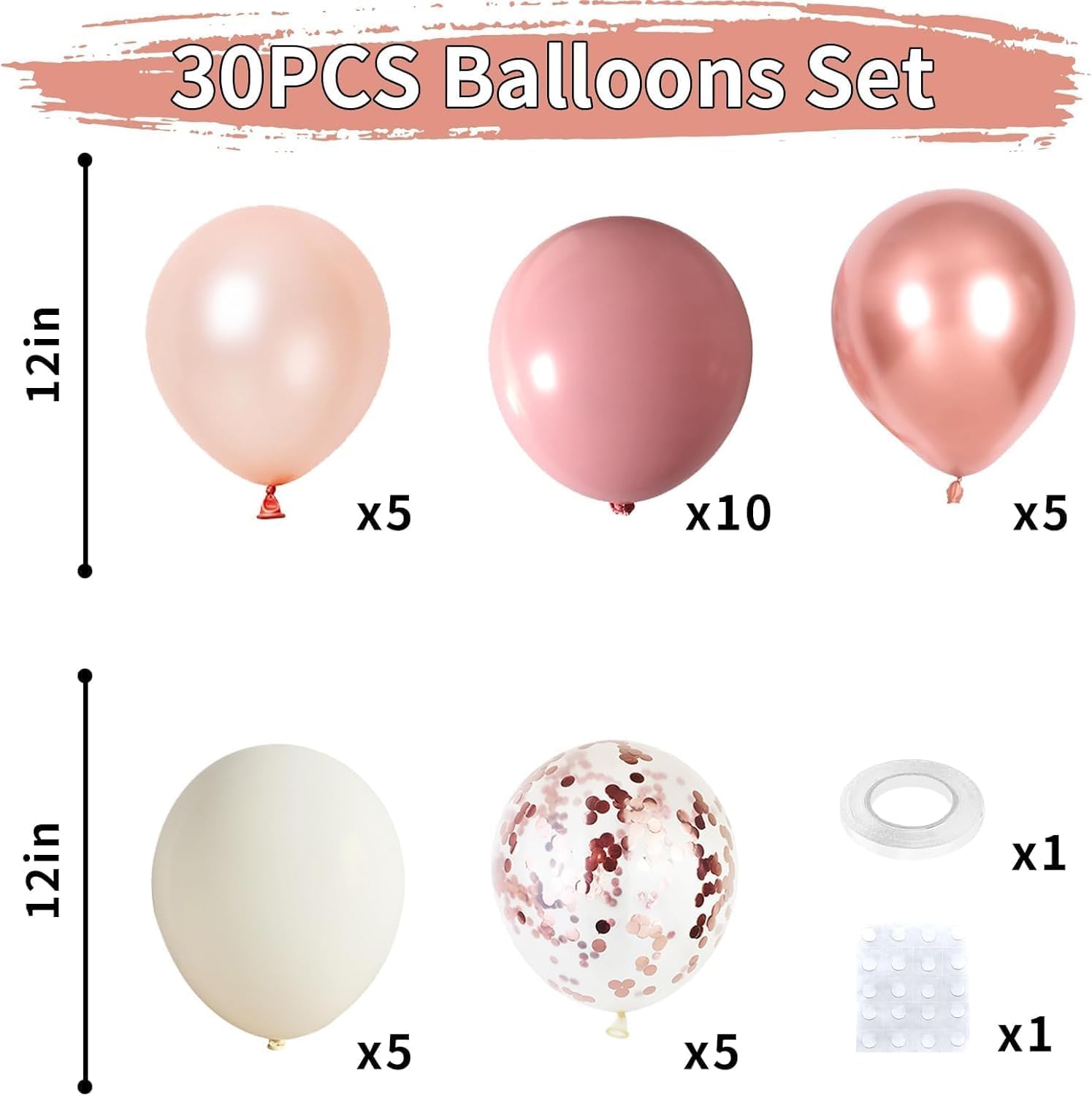 • Dusty Pink Boho Blush Balloon Sets: 10x dusty pink balloons, 5 x rosegold metallic balloons, 5 x ivory white balloons, 5 x pearl rosegold, 5 x rosegold confetti. That's a magnificent total of 30 pieces to unleash your creativity! Elevate your celebrations with our exquisite dusty pink white balloon sets!