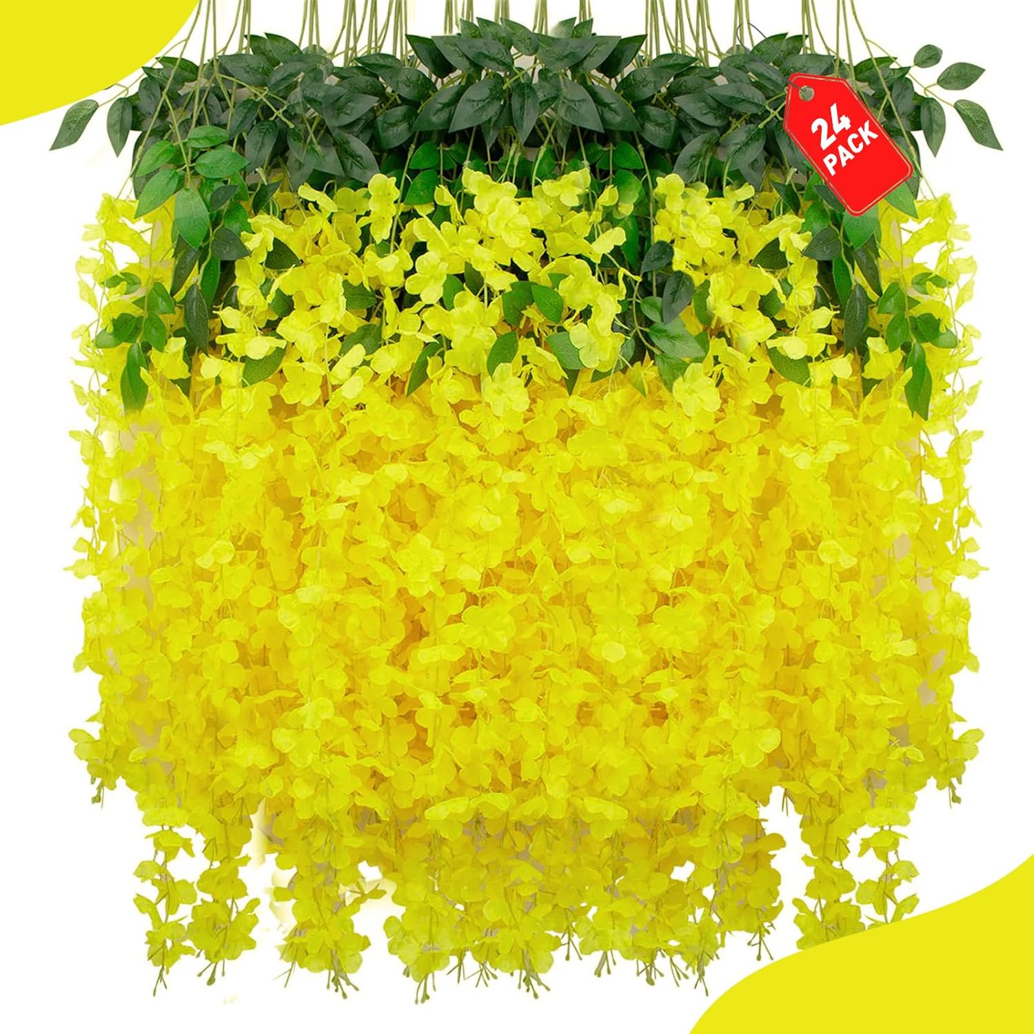24 Pack Yellow Wisteria Hanging Flowers, 3.4 Ft Fake Hanging Flowers, Artificial Wisteria Garland Vines for Wedding Room Backdrop Outdoor Patio Garden Decoration