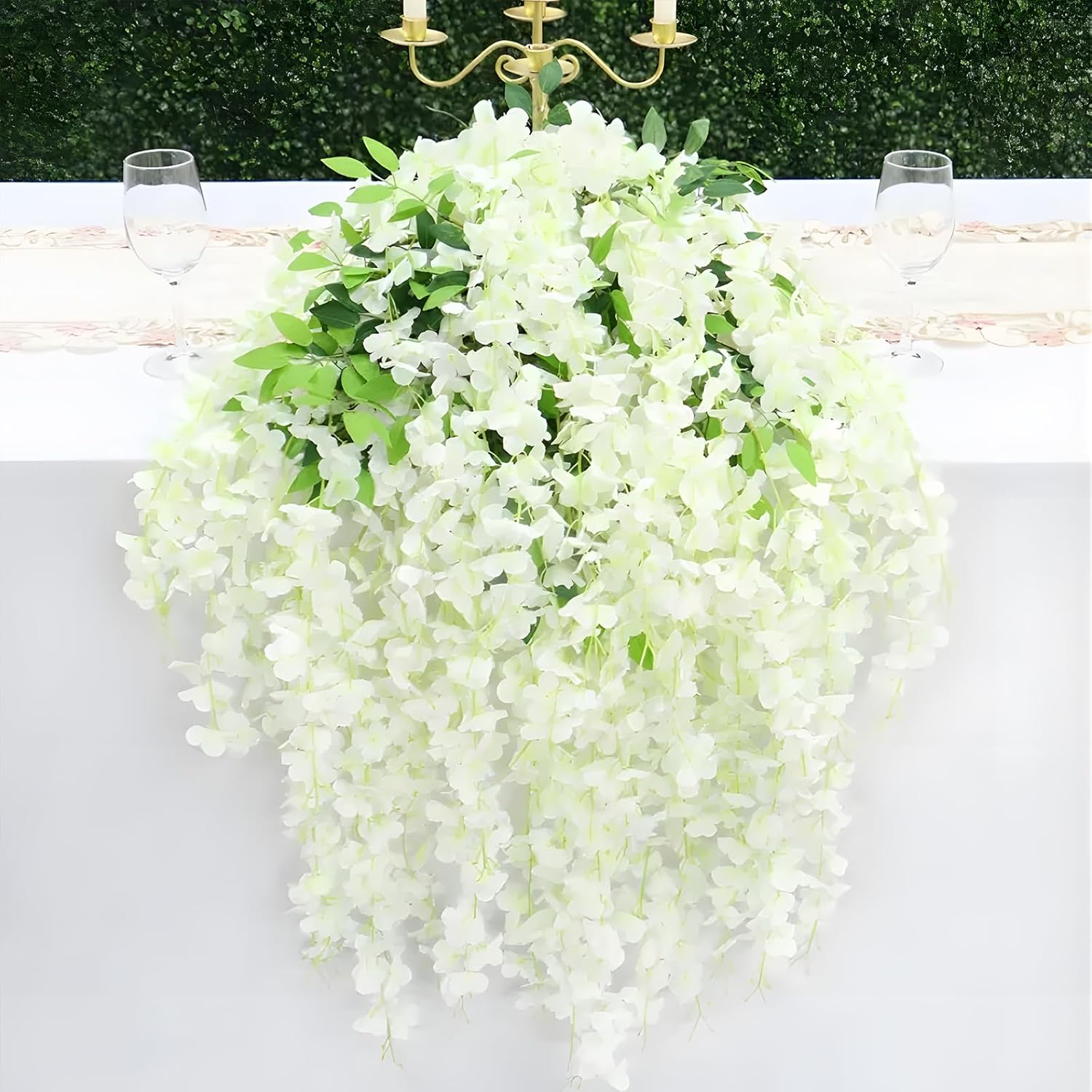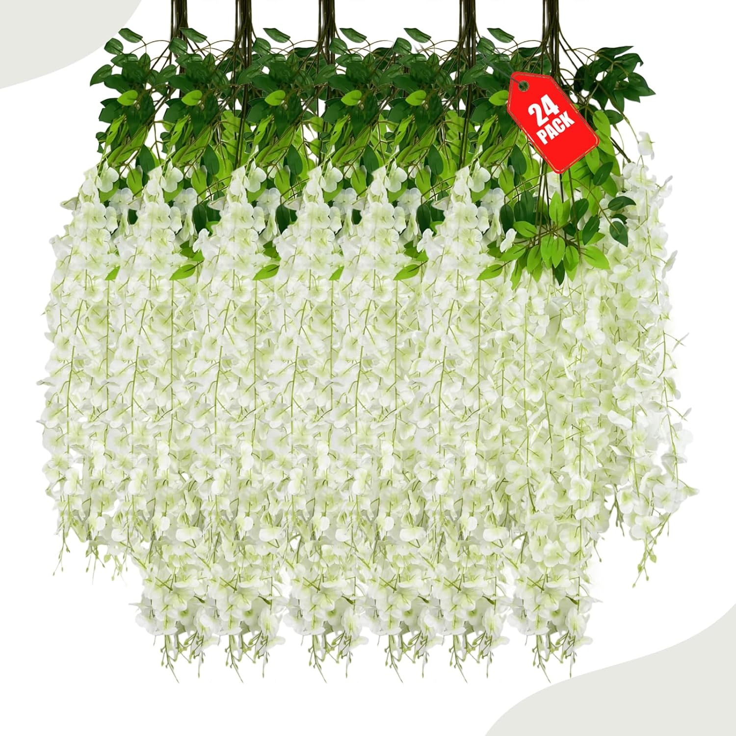 24 Pack Green White Wisteria Hanging Flowers, 3.4 Ft Fake Hanging Flowers, Artificial Wisteria Garland Vines for Wedding Room Backdrop Outdoor Patio Garden Decoration