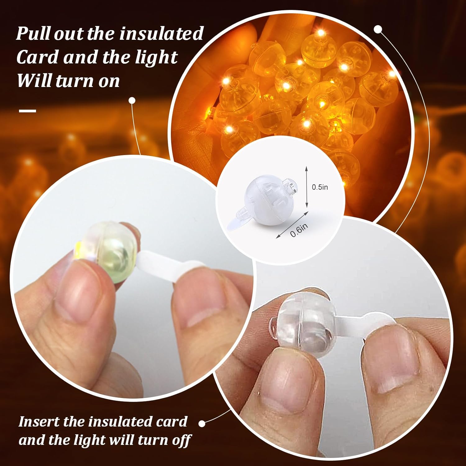 • Reusable Balloon Lights: You can turn off the light by putting the tabs back into the slot to save battery life; If you plan to reuse the lights, save the little tabs that you pull out to activate them; The replacement batteries are LR41