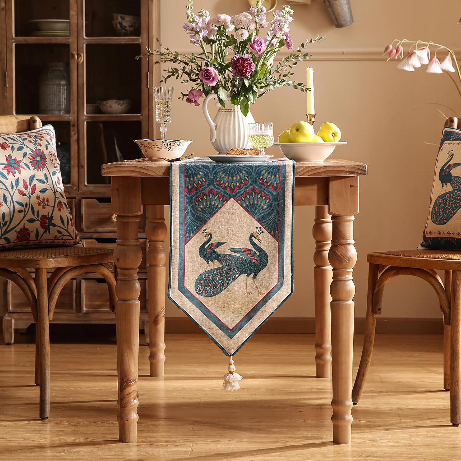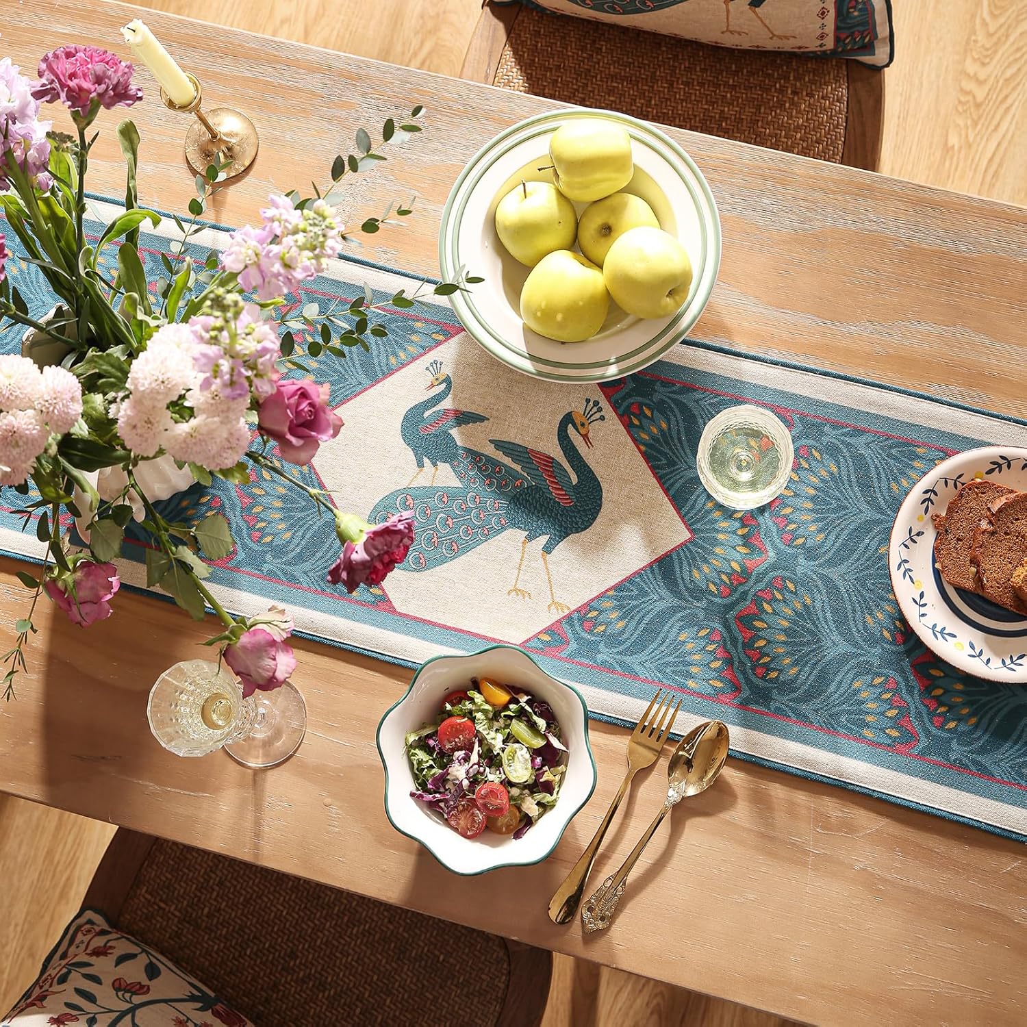 • Unique Design: The main pattern of this table runner matching features peacock feathers in a combination of peacock blue and flaxen colors. The dark outer part and light inner part inject a vivid retro and exquisite visual experience into the table setting.
