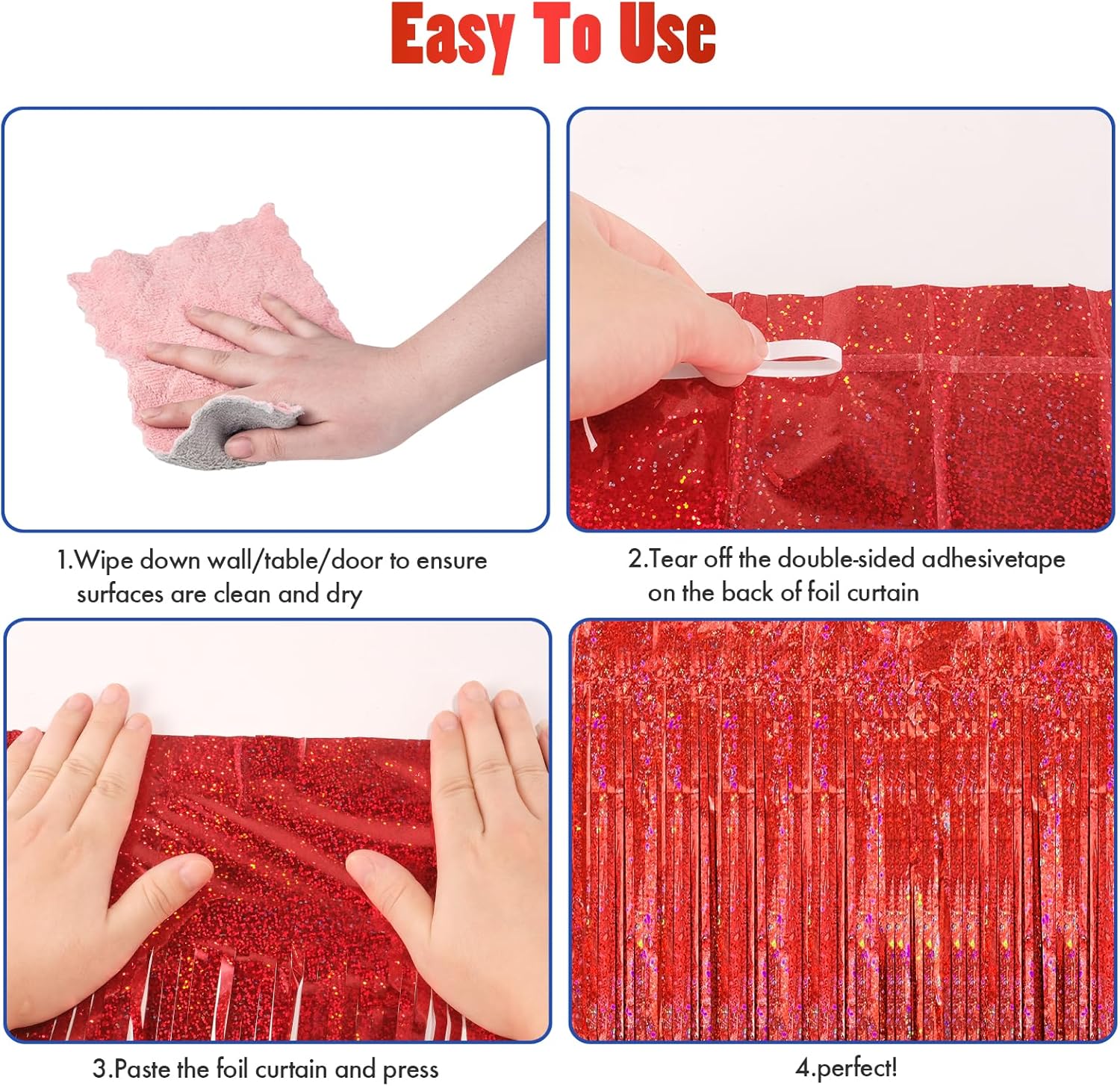 • 🎉NO HASSLE INSTALLATION - The foil curtain backdrop comes with double sided tape on the top, peel plastic strip off and it would be very easy to paste on smooth surfaces such as wall, window, table, door or anywhere you like. You can cut the foil curtain with scissors into the suitable Length, assemble the party streamers side by side to make the backdrop larger, or layer the backdrop curtains to get a thicker effect.