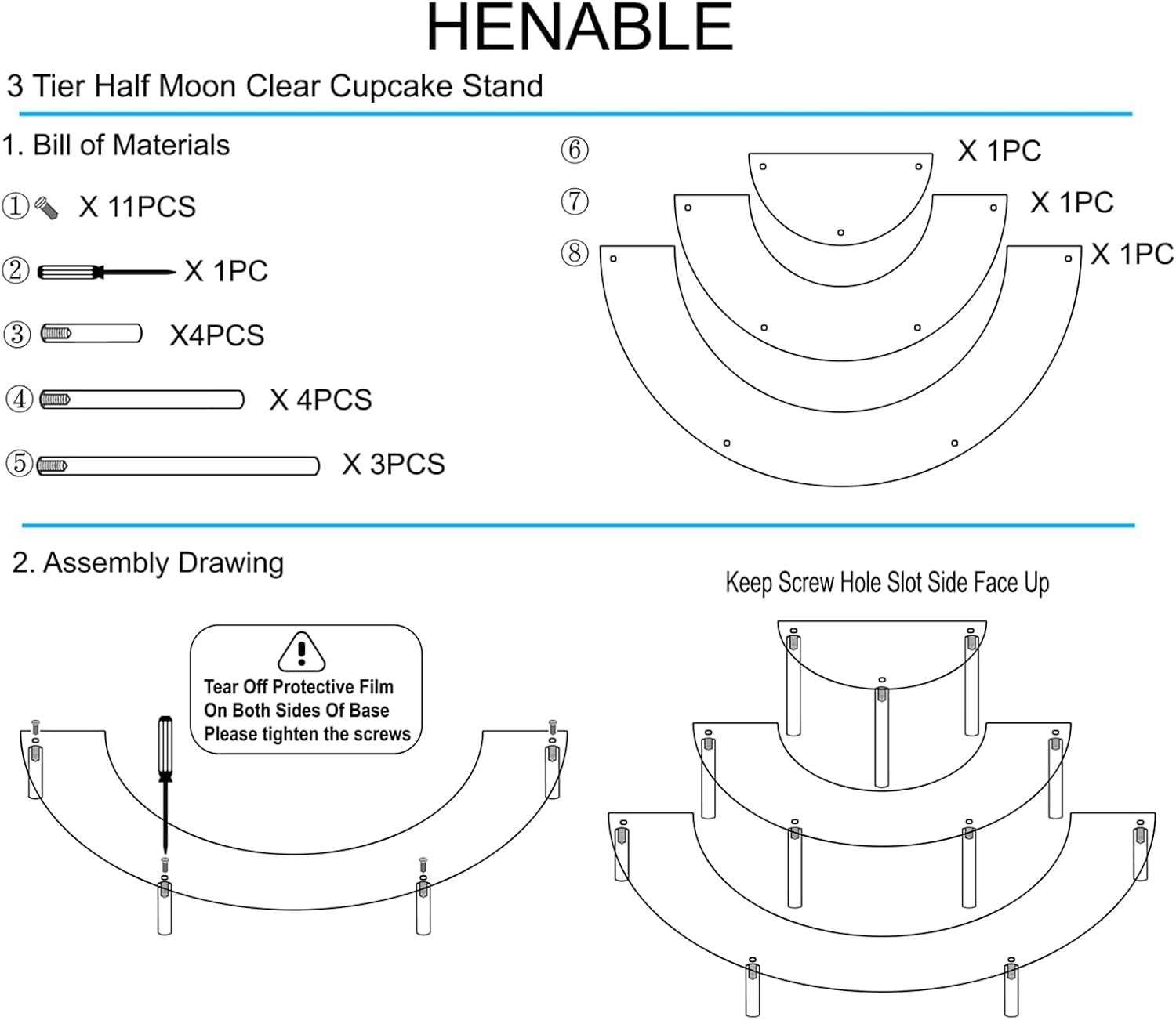 • What You Get: Acrylic half-moon dessert stand include 1 X 3-tier display stand, 1 X Phillips Screwdriver, 1 X Specification