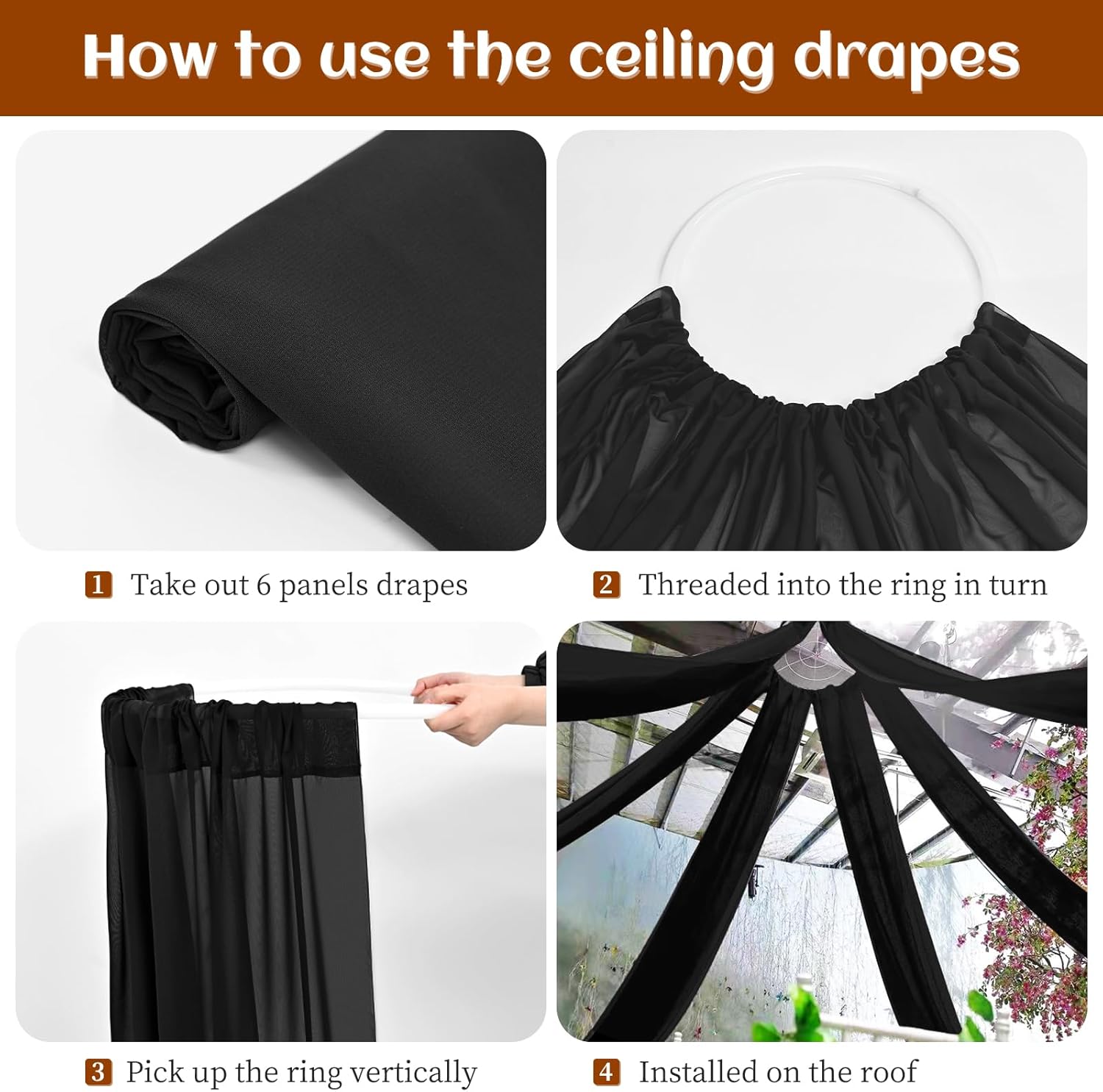 • 📸Chiffon Ceiling Drapes: The package include 6 panels black wedding ceiling drapes (without hanging pieces). Each wedding extra long curtain measure for 5 feet width x 20 feet length. The sufficient quantity can meet your demands for decorating your weddings, parties, receptions. It will help to create a delicate and aesthetic sense to your wedding ceiling decoration.