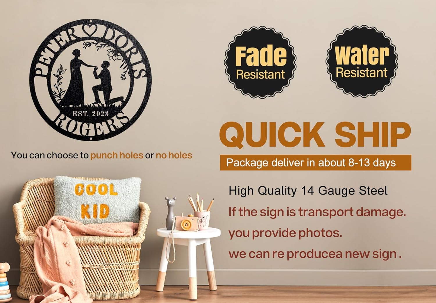 • HIGH-QUALITY CRAFTSMANSHIP: Our personalized wedding sign is Cut from heavy-duty grade 14 steel (0.08 inches thick). Heavy duty grade 14 steel will not be as thin as grade 16 and grade 18 steel, with a smooth surface and durability,These name signs will not flex nor break like products made of inferior materials.Your personalized metal sign used powder coated to give a smooth finish and long term durability