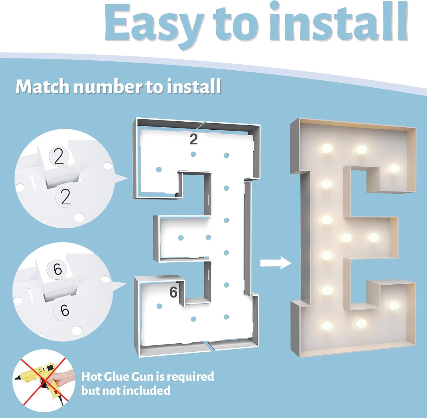 • ASSEMBLY REQUIRED: The marquee numbers need to be assembly with hot glue gun(not included in the package) Assemble it in advance will make your party amazing and fantastic