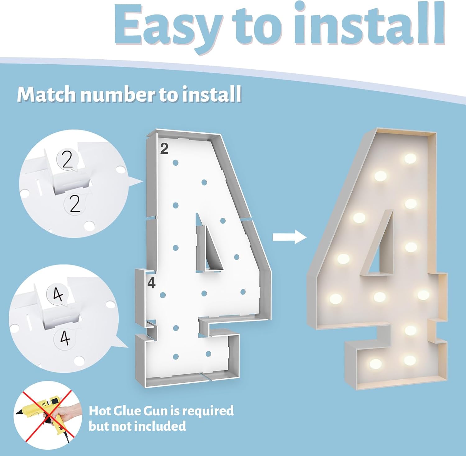 • ASSEMBLY REQUIRED: The marquee numbers need to be assembly with hot glue gun(not included in the package) Assemble it in advance will make your party amazing and fantastic