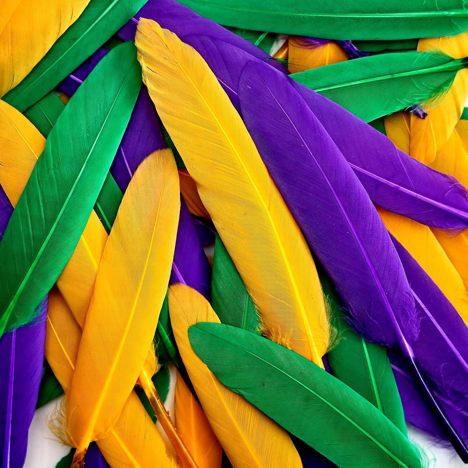 FeelfunFeather 120pcs Mardi Gras Goose Cochettes Feather 4-6 inch Decorative Colorful Purple Golden Yellow Green Feathers Bulk for DIY Crafts Masquerade Carnival Party Decoration
