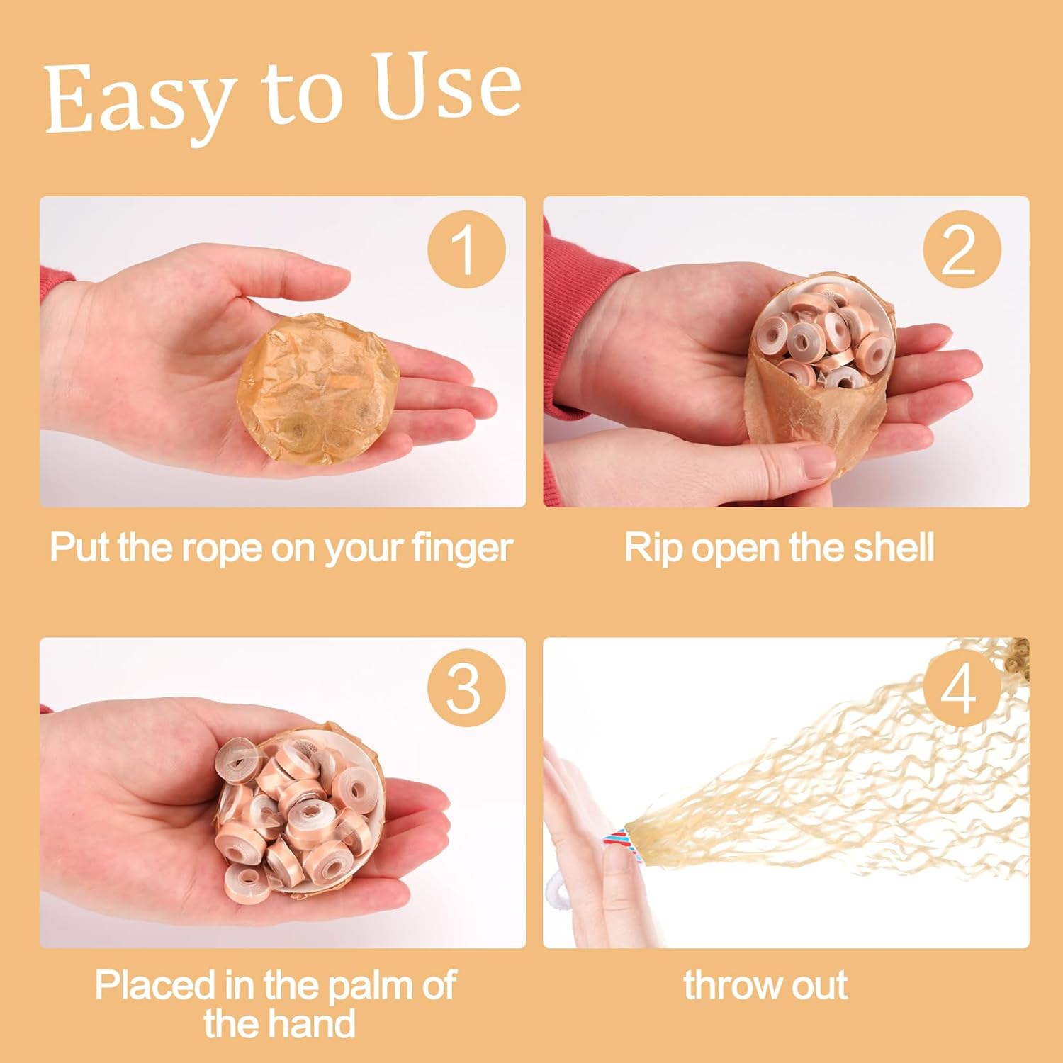 • How to use - Put the looped handle above the ribbons on your finger, then tear the wrapping paper at the bottom and throw them at a forward and upward angle, the more ribbons you throw at the same time the better the result. You can achieve a shocking effect and an instant lift in atmosphere