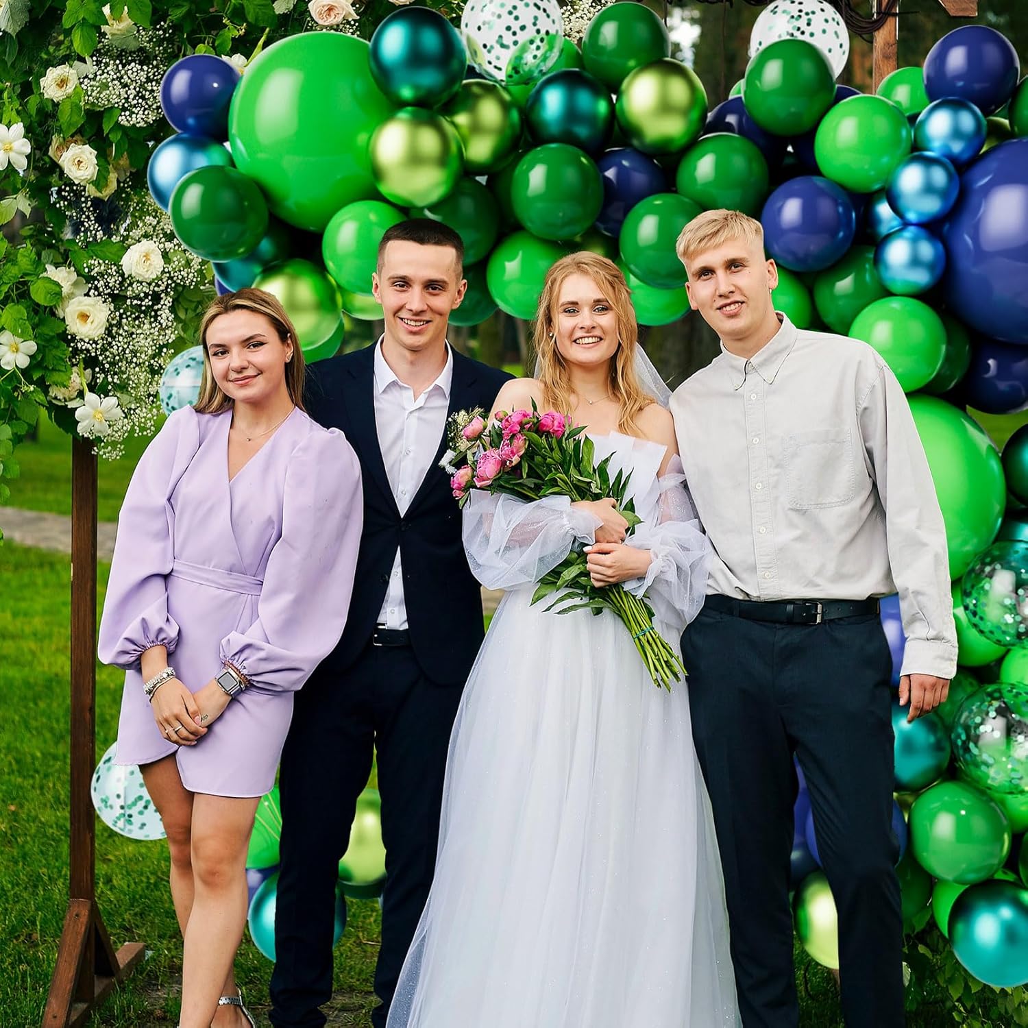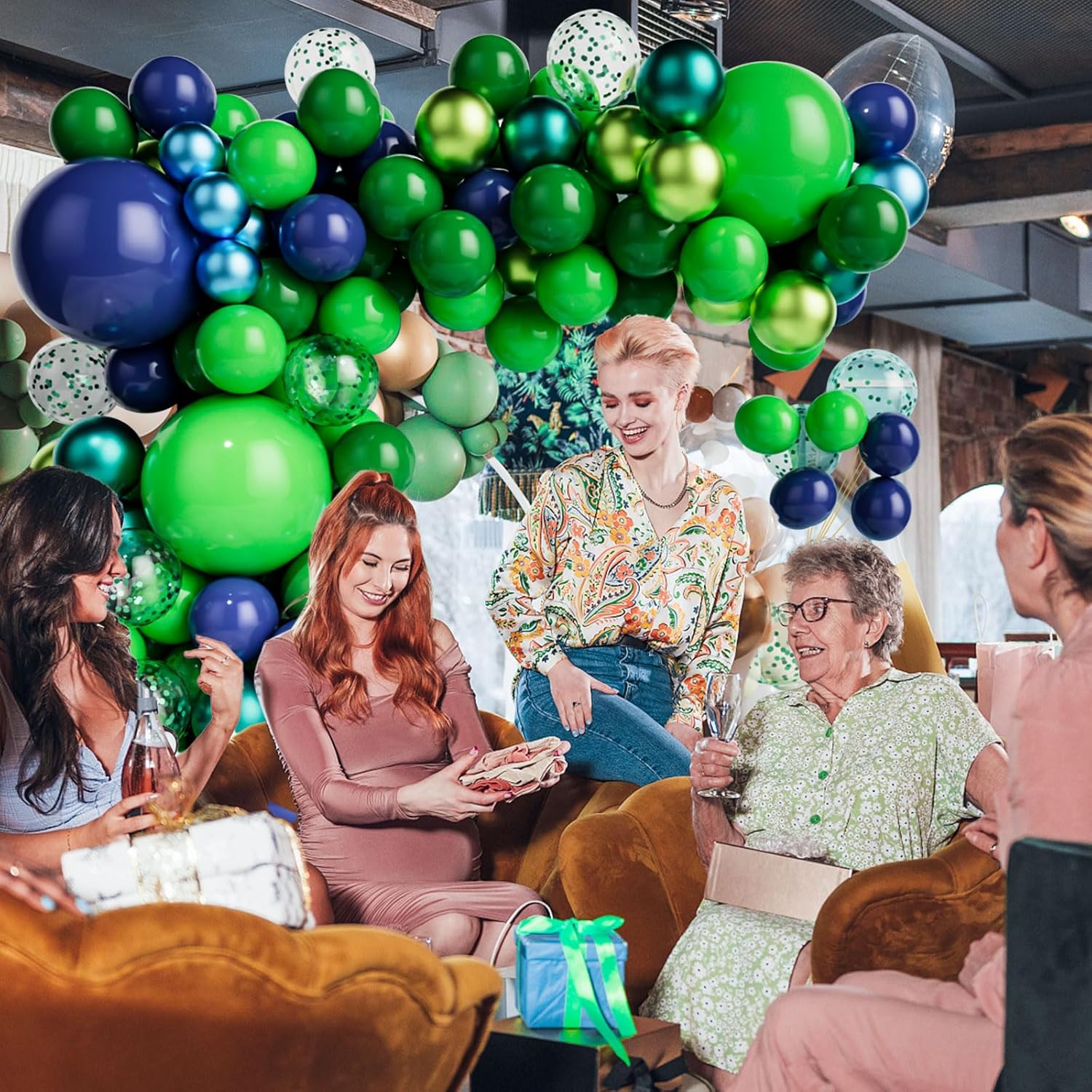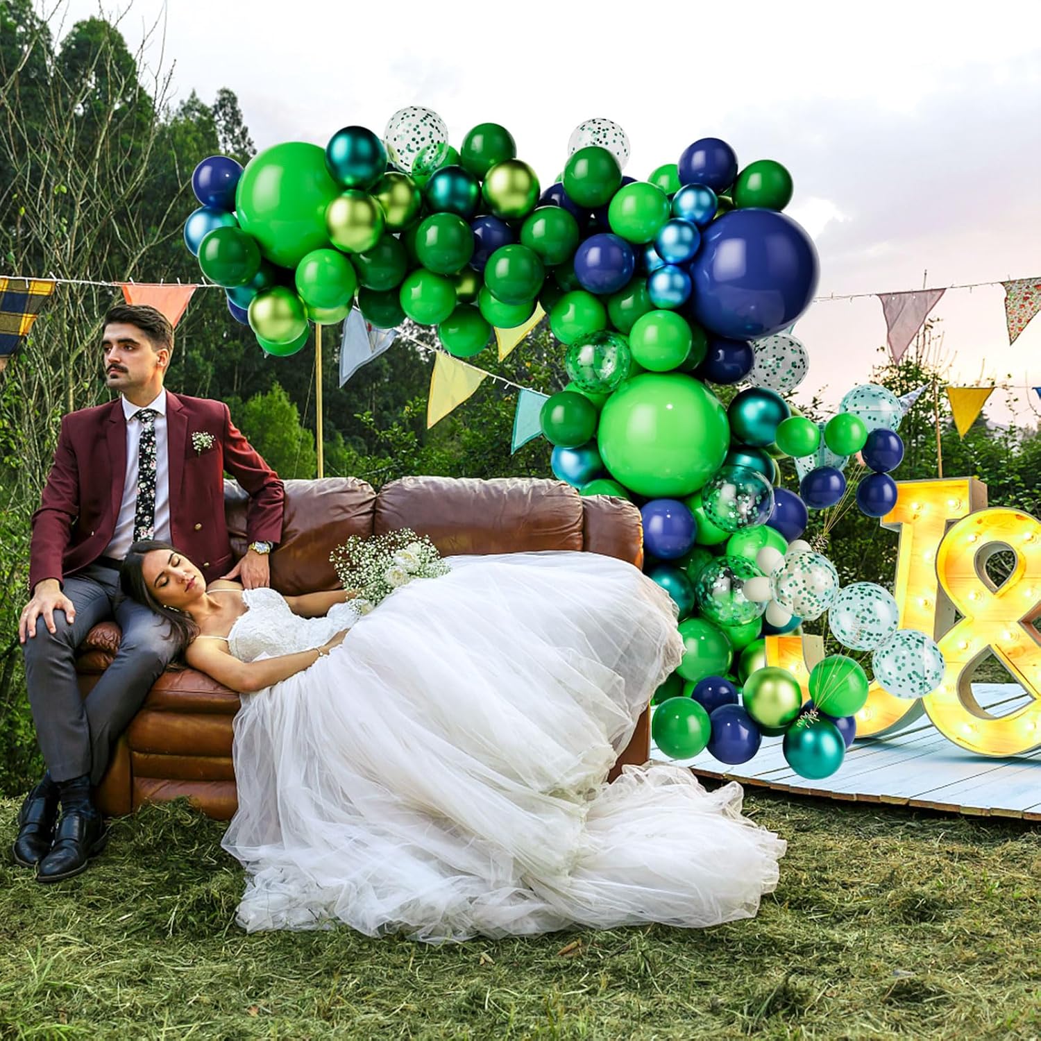 • The 91pcs Blue and Green balloons arch kit includes:2pcs 18inch balloons( 1pc Dark blue and 1pc Green), 5pcs 12inch green confetti balloons,50pcs 10inch balloons( 10pcs dark green,5pcs fruit green, 5pcs metallic green, 10pcs green,5pcs metallic blue, 15pcs dark blue),32pcs 5inch balloons( 10pcs dark blue,10pcs metallic blue,6pcs fruit green,6pcs metallic green).1 roll glue dots and 1 roll arch balloon strip tape.