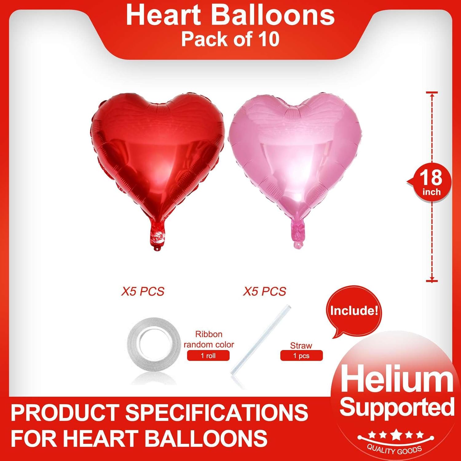 • Package Included:10Pcs (Pink*5+Red*5)18 inch Heart Balloons(uninflated) + 1pcs Straw +1pcs 32 foot Ribbon Roll+20 Dots Glue