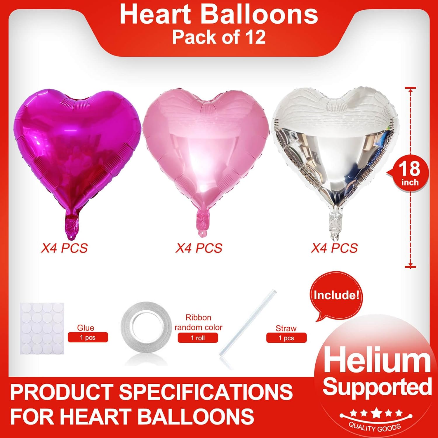 • Package Included:12Pcs (Pink*4+Silver*4+Hot Pink*4)18 inch Heart Balloons (uninflated) + 1pcs Straw +1pcs 32 foot Ribbon Roll+20 Dots Glue