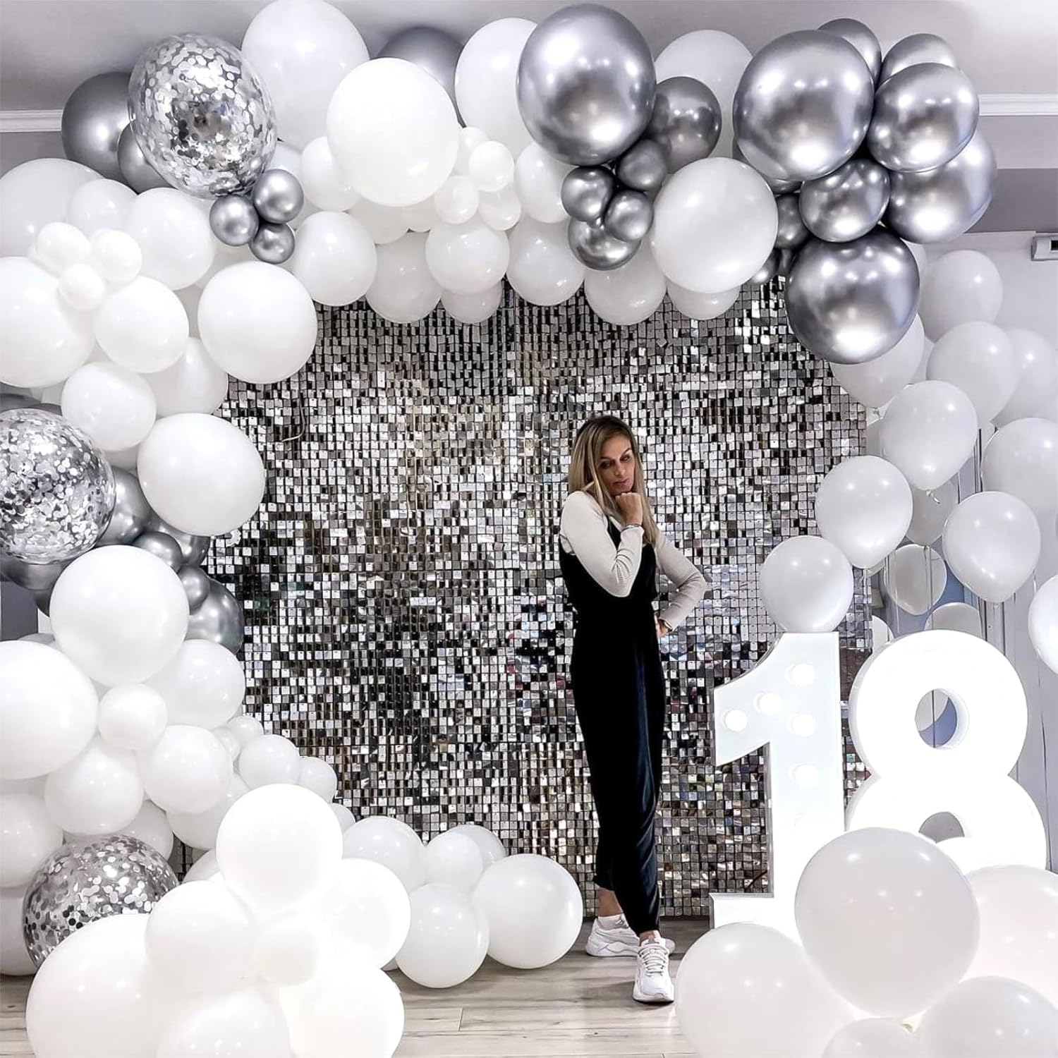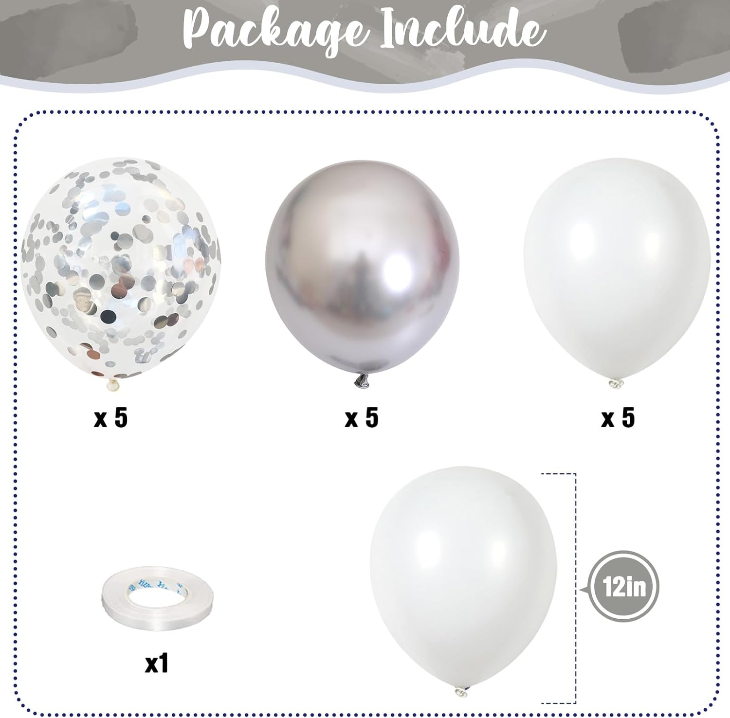 • ๐ŸŽ‰ Silver White Balloons - You will get 35 pieces 12 inch latex party balloons set, includes white 15pcs, metallic silver 10pcs, silver confetti 10pcs, come with 1pc silver balloon ribbon. Perfect for women men birthday baby bridal shower wedding new year party decorations supplies.