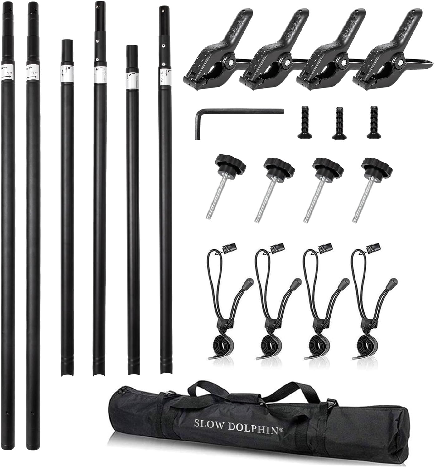 • The kit Package Include: (2) x Heavy Duty Base (2) x 10ft Adjustable Vertical Tube(2) x 5ft Top Crossbar (2) x 5ft Bottom Crossbar (4) x Long Screws(3) x Short Screws (1) x Hex Key Wrench (4) x Photo Spring Clamp/ (4) x Background Multifunctional Clips Holder (2) x wing nut (1) x Carry Bag.