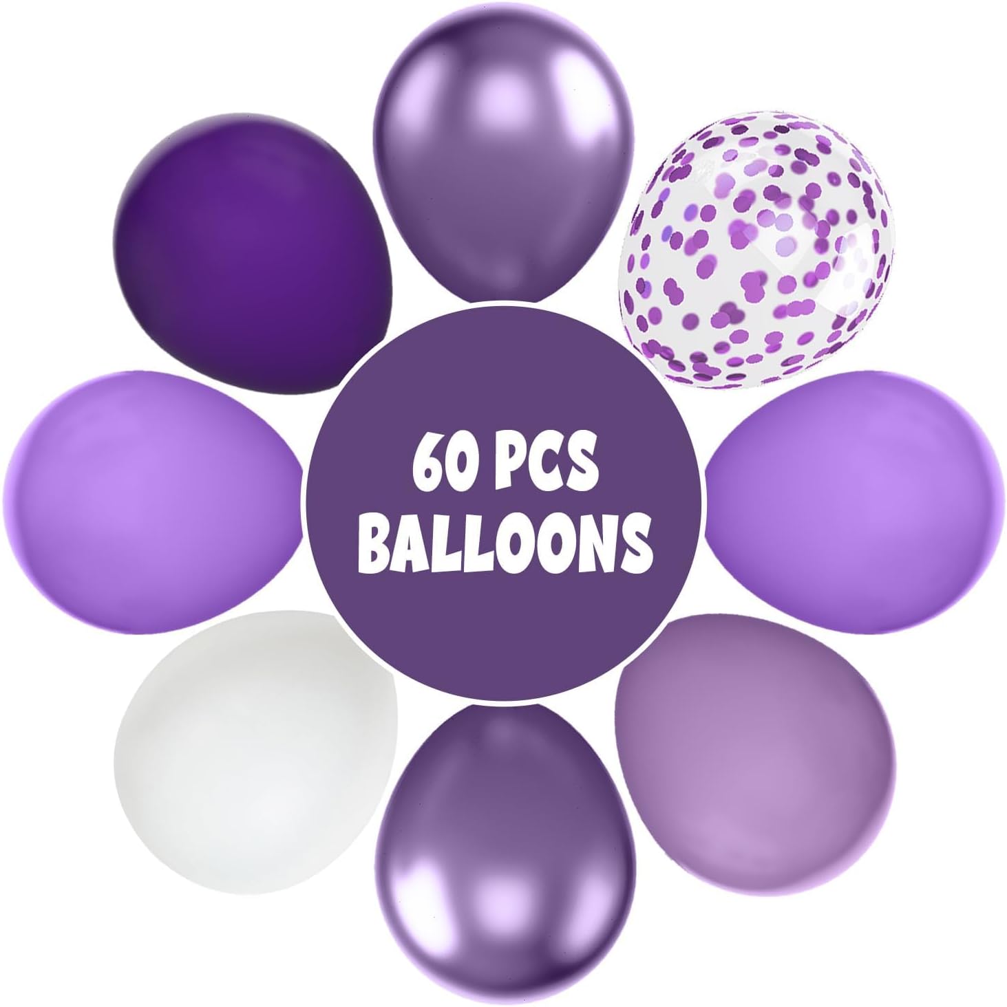 • Package Included : Our 12 inch purple balloons set includes: 16 pcs purple balloons, 12 pcs taro purple balloons, 12 pcs white balloons, 8 pcs dark purple balloons, 6 pcs metallic purple balloons, 6 pcs purple confetti balloons, 2 pcs ribbons