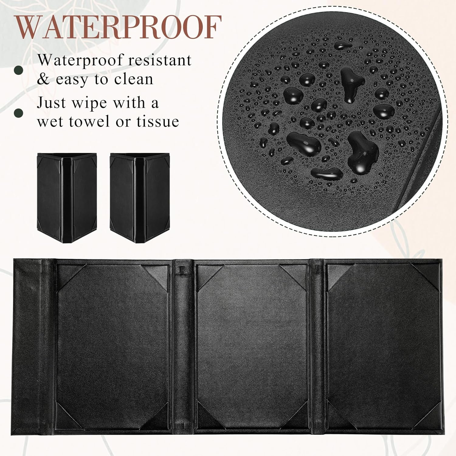 • Convenient and Reliable: crafted with PU artificial leather, these table display menu holders are built to endure frequent use and daily wear and tear; Their durability ensures they maintain their sleek appearance and functionality even with constant handling; Keep your menus safe from stains, spills, and scratches