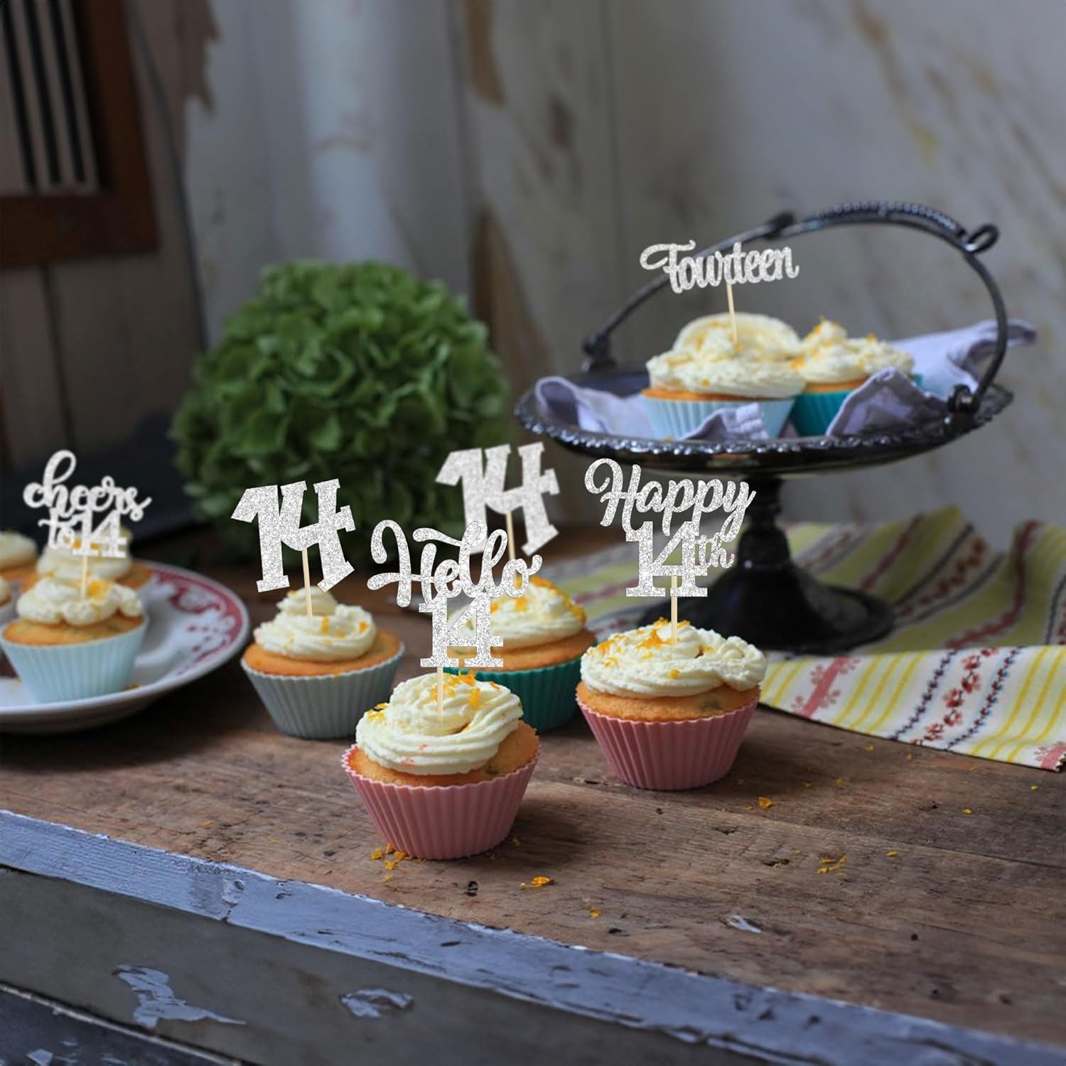 30Pcs 14th Birthday Cupcake Toppers Hello 14 Cupcake Picks Fourteen Cheers to 14 Years Old Cake Decorations for 14th Birthday Anniversary Party Supplies Silver Glitter
