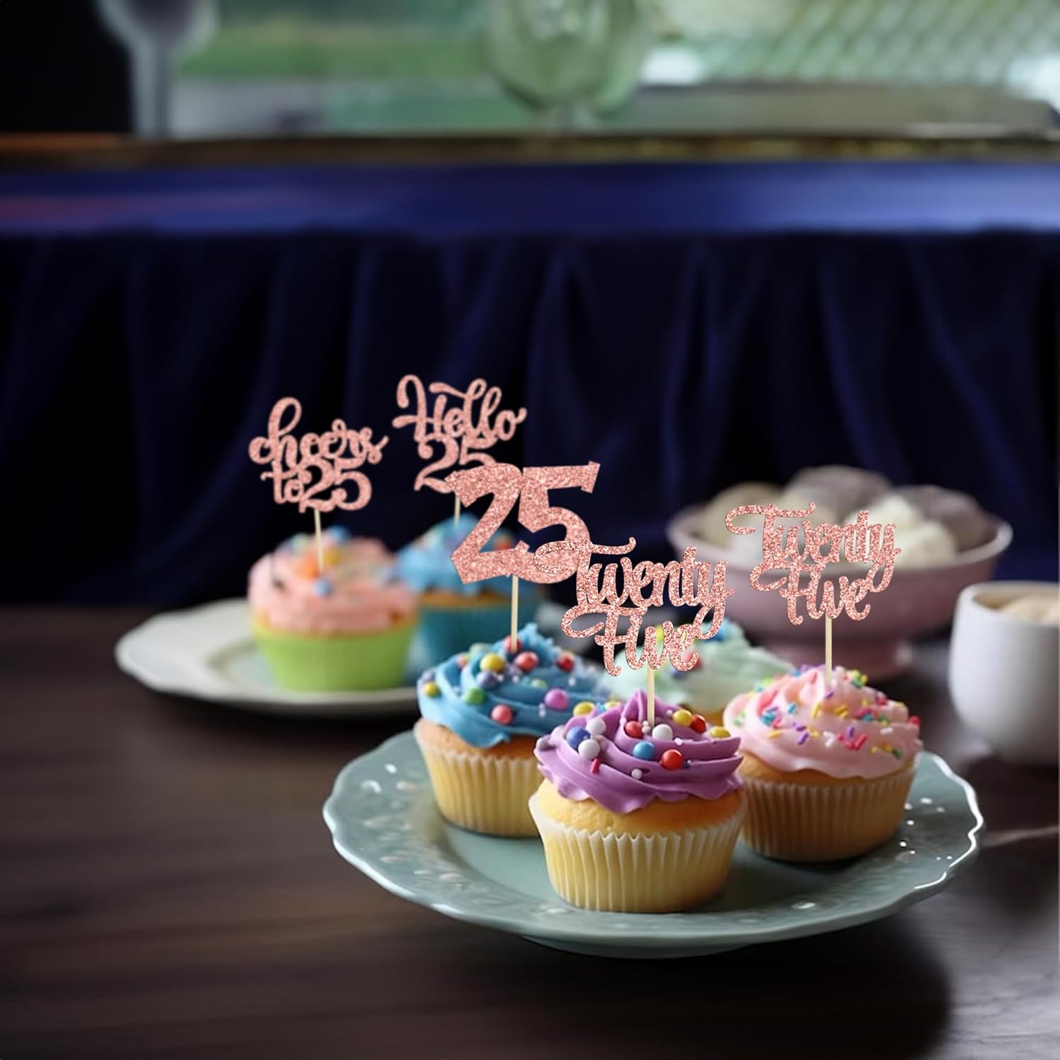30pcs 25th Birthday Cupcake Toppers - 25th Anniversary Cake Decorations - Rose Gold Glitter