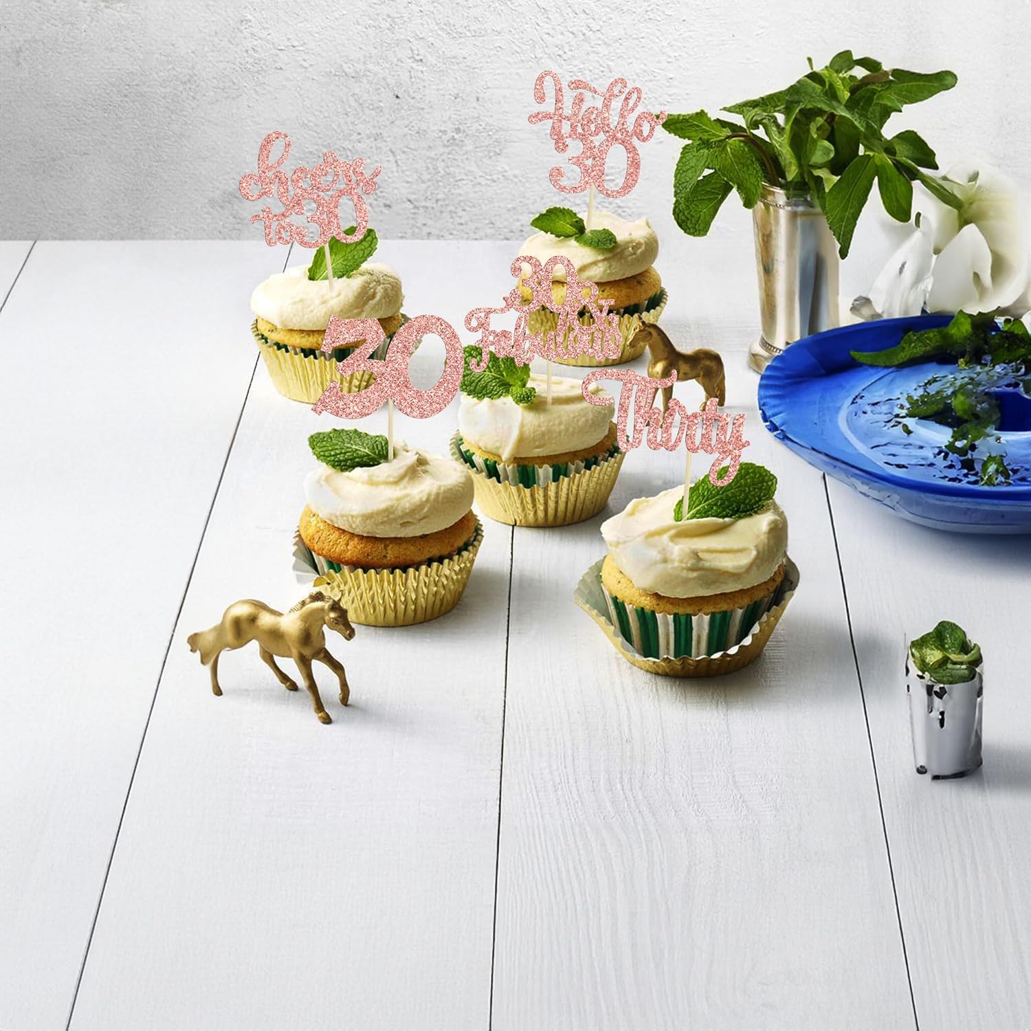 30Pcs Happy 30th Birthday Cupcake Toppers Rose Gold Glitter Thirty Cheers to 30 Birthday Cupcake Picks for Happy 30th Birthday Anniversary Party Cake Decorations Supplies