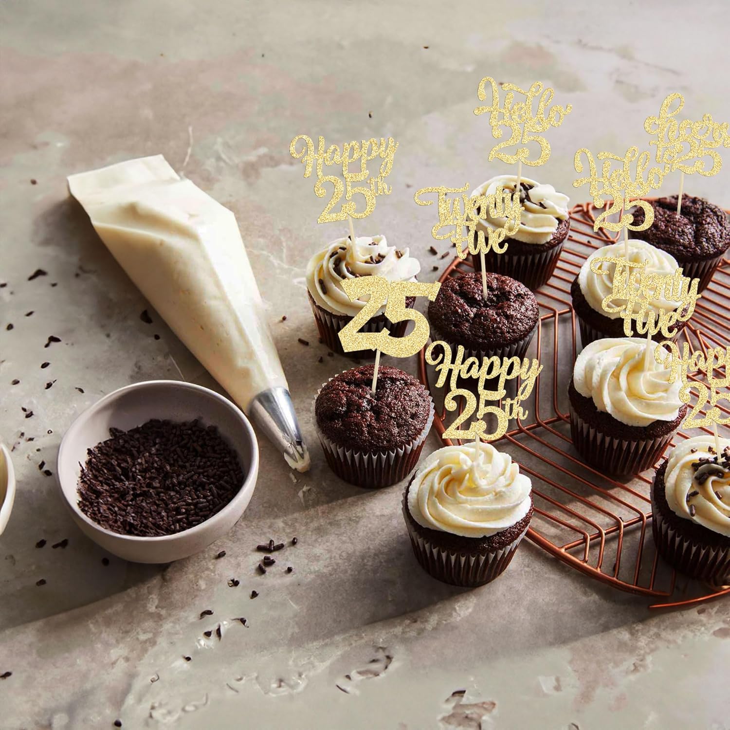 • -Package included: 24Pcs Happy 25th Birthday Cupcake Toppers. Comes with assembled, so you can insert into your cake directly, which make your cake more interesting.