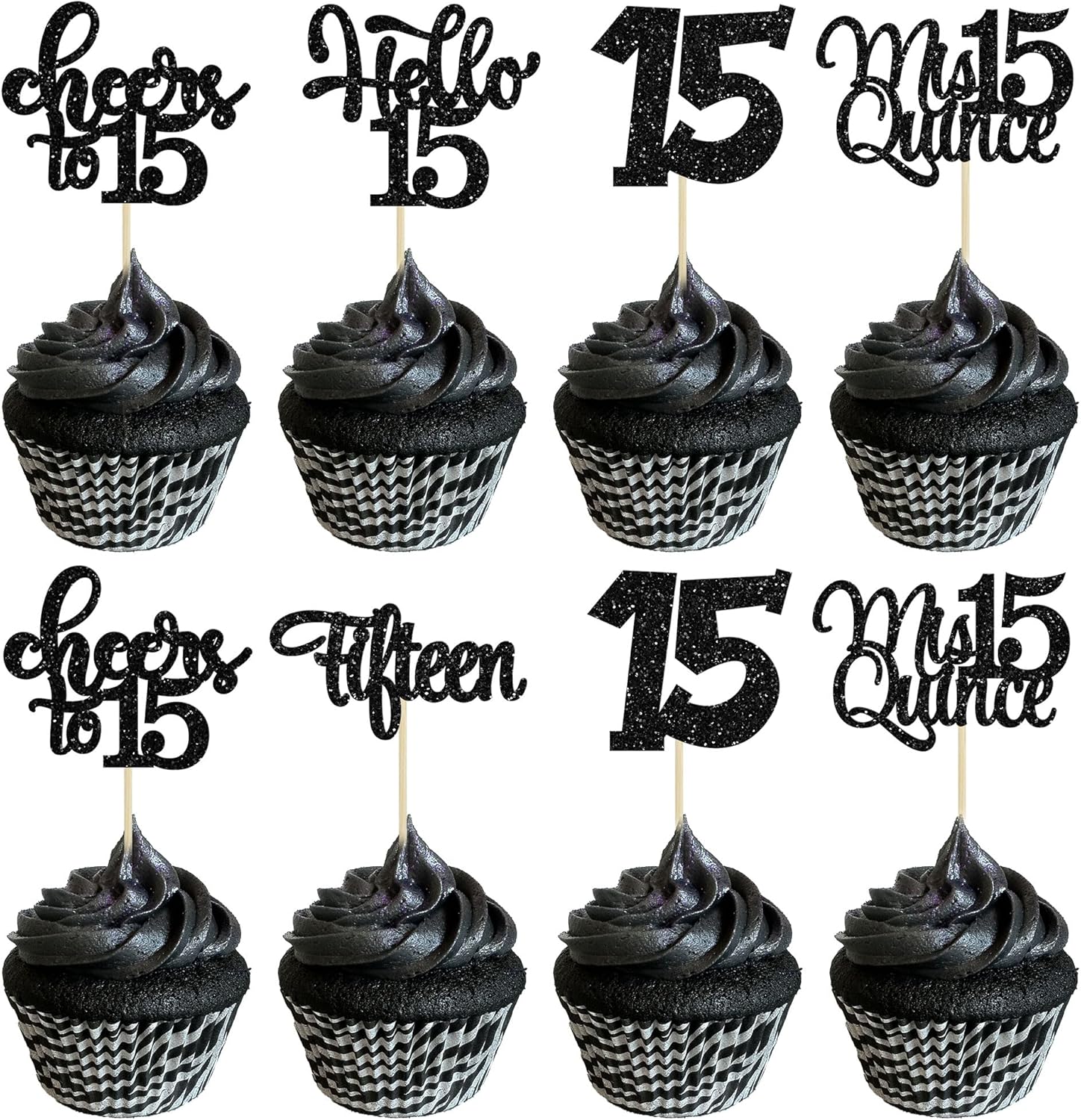 30Pcs 15th Birthday Cupcake Toppers Fifteen Cupcake Picks Cheers to 15 Years Old Mis Quince 15 Cake Decorations for 15th Birthday Anniversary Party Black Glitter