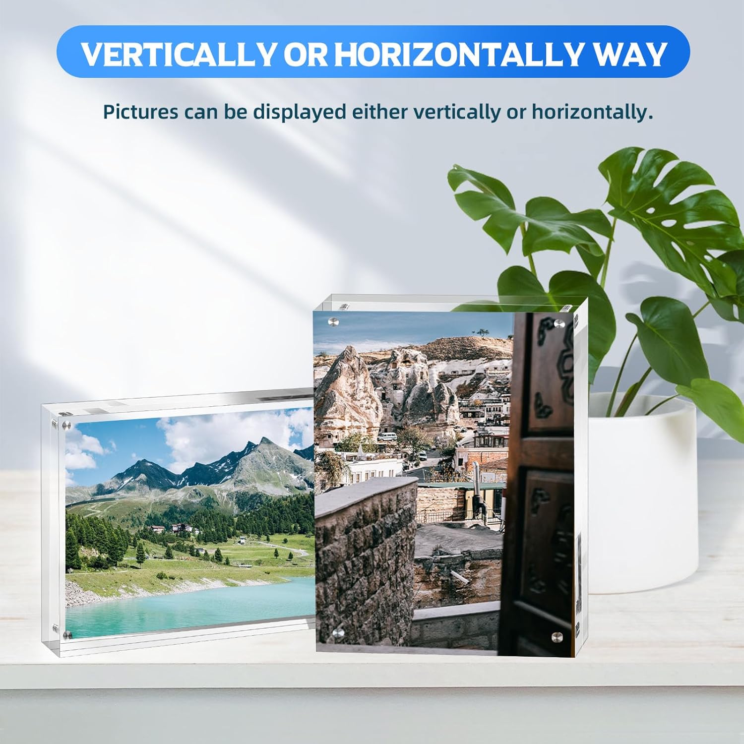 • 【Premium Quality】​Crafted from high-density acrylic panels, this premium photo frame ensures protection against fading from sunlight or fluorescent illumination. Comprising two robust acrylic blocks secured by four corner magnets, the clear frame guarantees stability in both landscape and portrait orientations, keeping your picture securely in place.