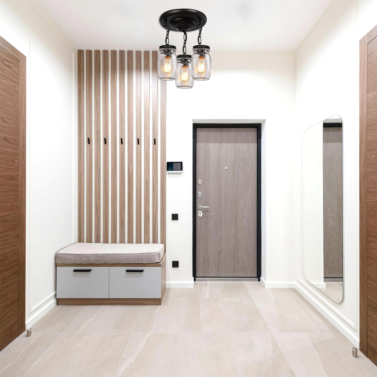 Glass Mason Jar Light Fixtures, 3-Lights Pendant Ceiling Lights Flush Mount - Black Country Farmhouse Lights for Kitchen Dining Room Foyer Stairway Hallway Entryway Porch