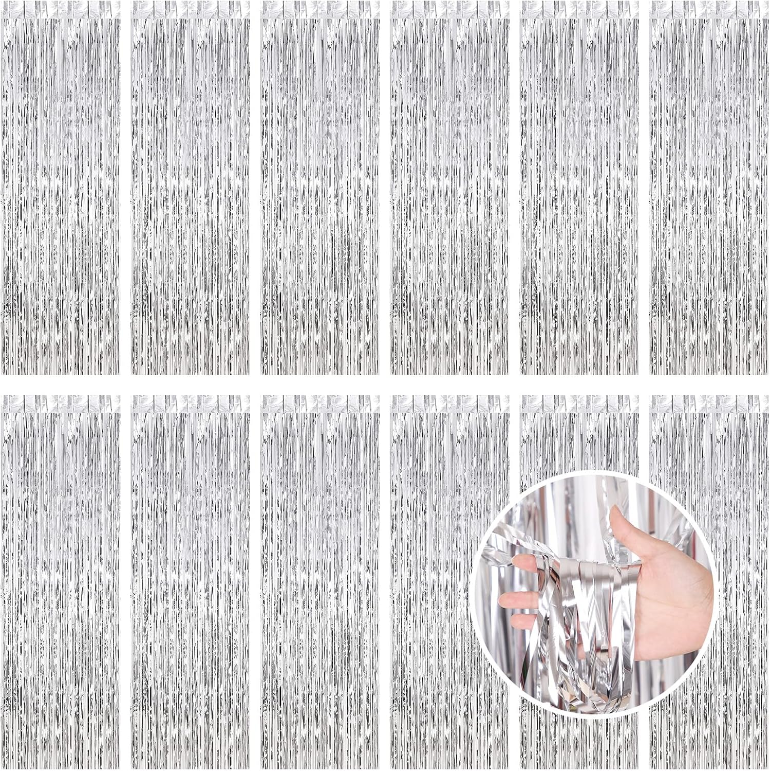 Silver Fringe Curtain Party Streamers, 12 Pack 3.3ft x 8.2ft Foil Curtain Backdrop Tinsel Foil Fringe Curtains Photo Booth Backdrop Streamer for Birthday, Wedding, Baby Shower, Disco Party