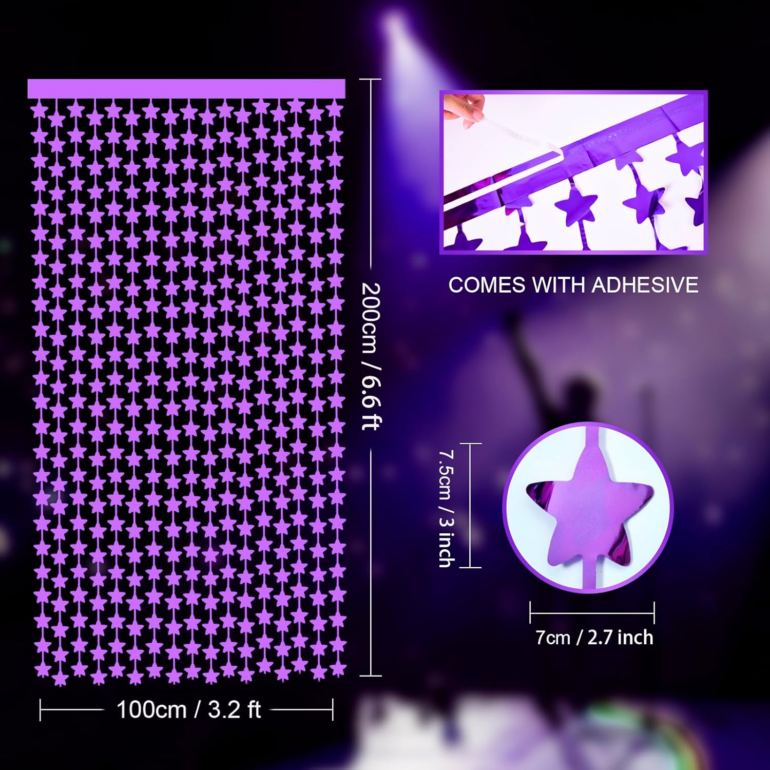 • πŸ’œγ€ Let's Make Your Party Sparkle! 】: Our 2 pack Purple stars foil fringe curtains, Large size (width x drop) 3.3 x 6.6 ft each, perfect photo backdrop for various parties.