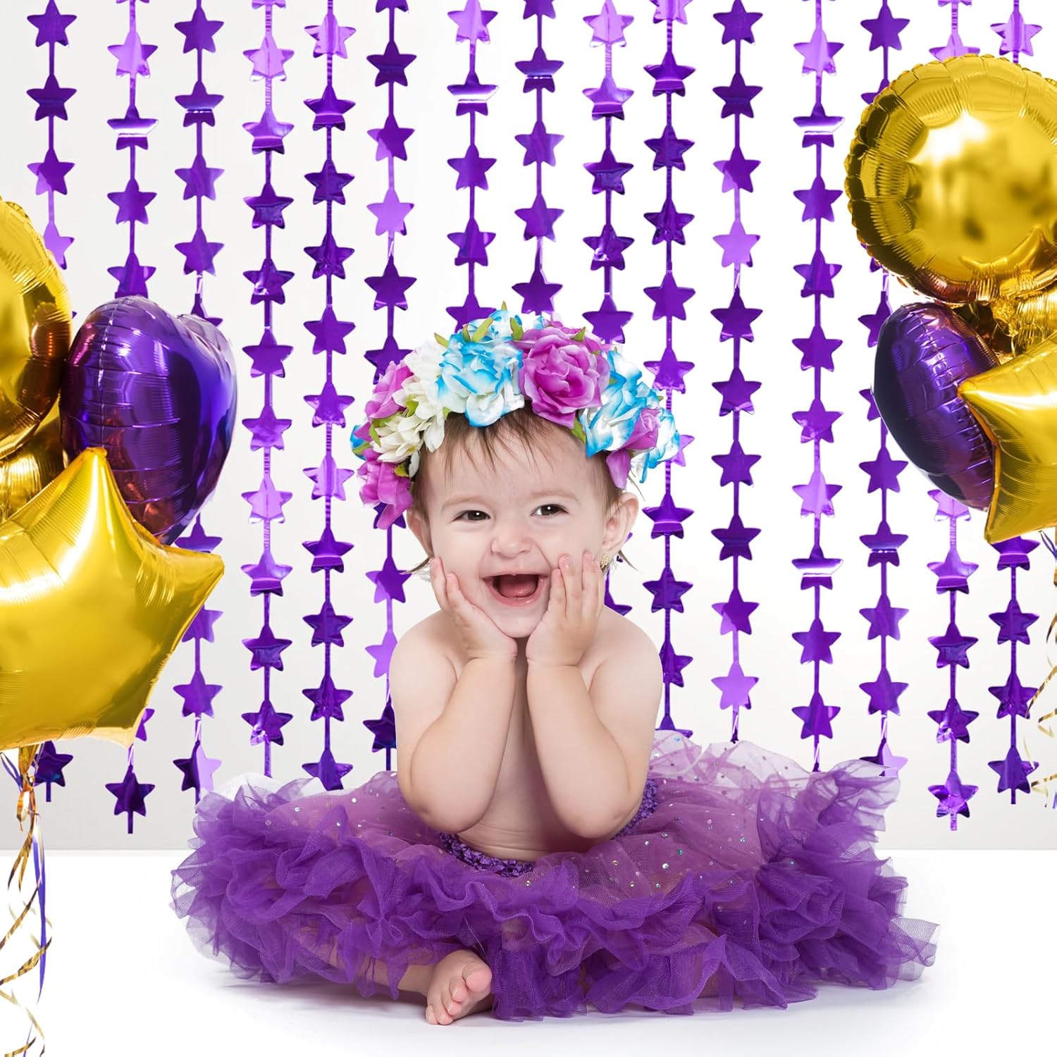 • πŸ–€γ€TINSEL MATERIAL】: Our glitter purple stars streamers is made of tinsel with shiny surface, lightweight and durable metallic fringe curtains. High quality fringe curtains, high toughness, unbreakable, can be used for a long time.