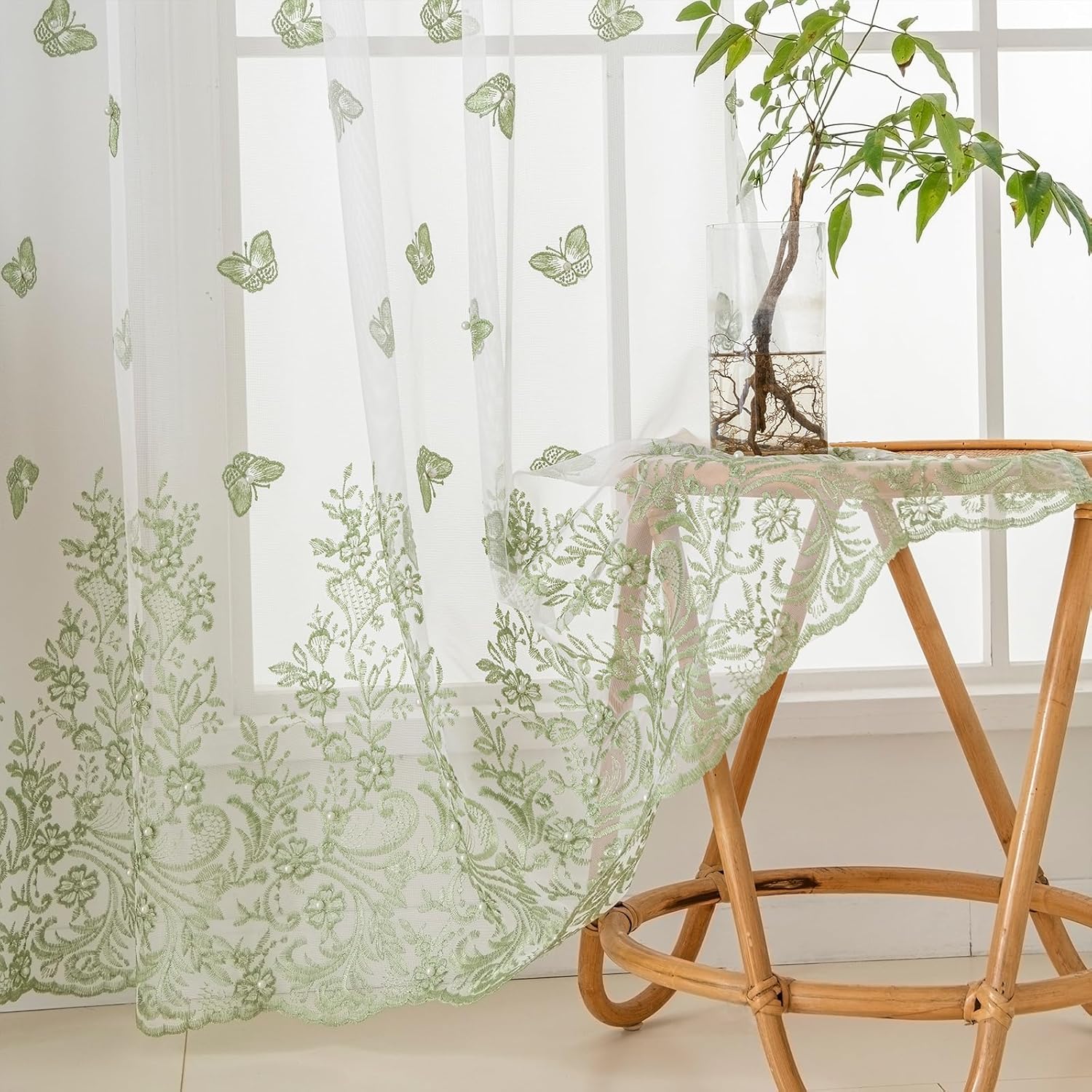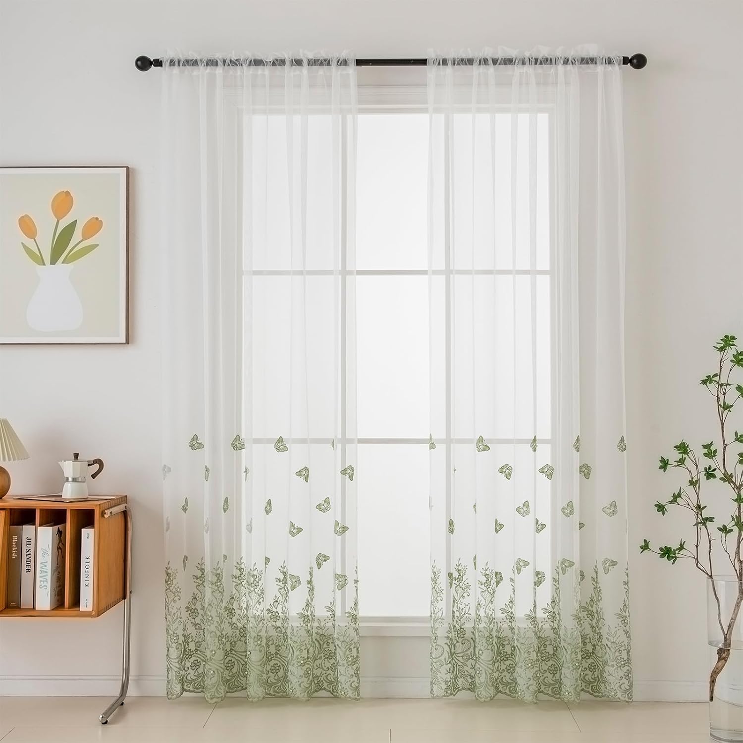 VISIONTEX White Sheer Voile Curtains, Decorative Green Embossed Butterflies Rod Pocket Window Drapes for Home Kitchen, Living Room and Bedroom 54 x 95 Inch, Set of 2 Curtain Panels
