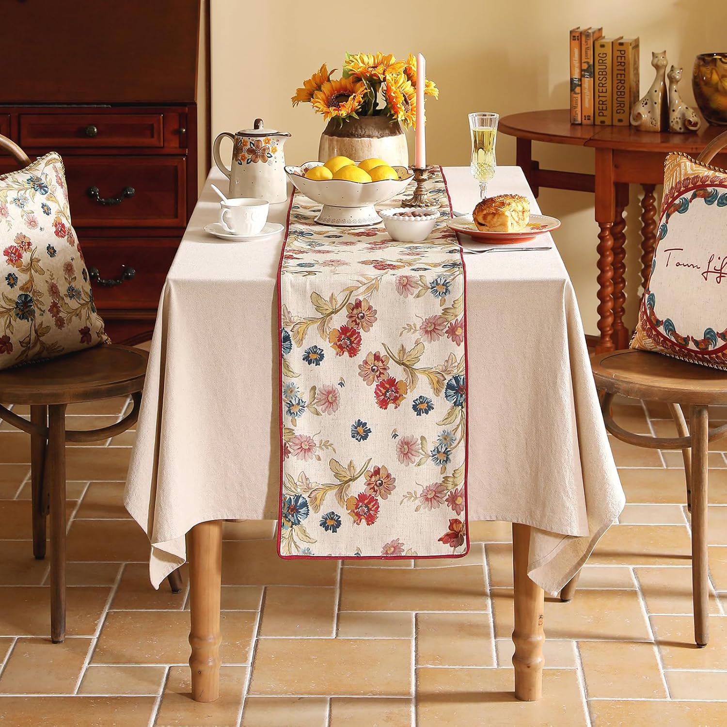 patdrea Designer Farmhouse Linen Thick Table Runner, Rustic Cottage Beige with Floral Pattern Fabric Table Mat, Decoration for Kitchen Dining Coffee Table Banquet Christmas , 12"*102"