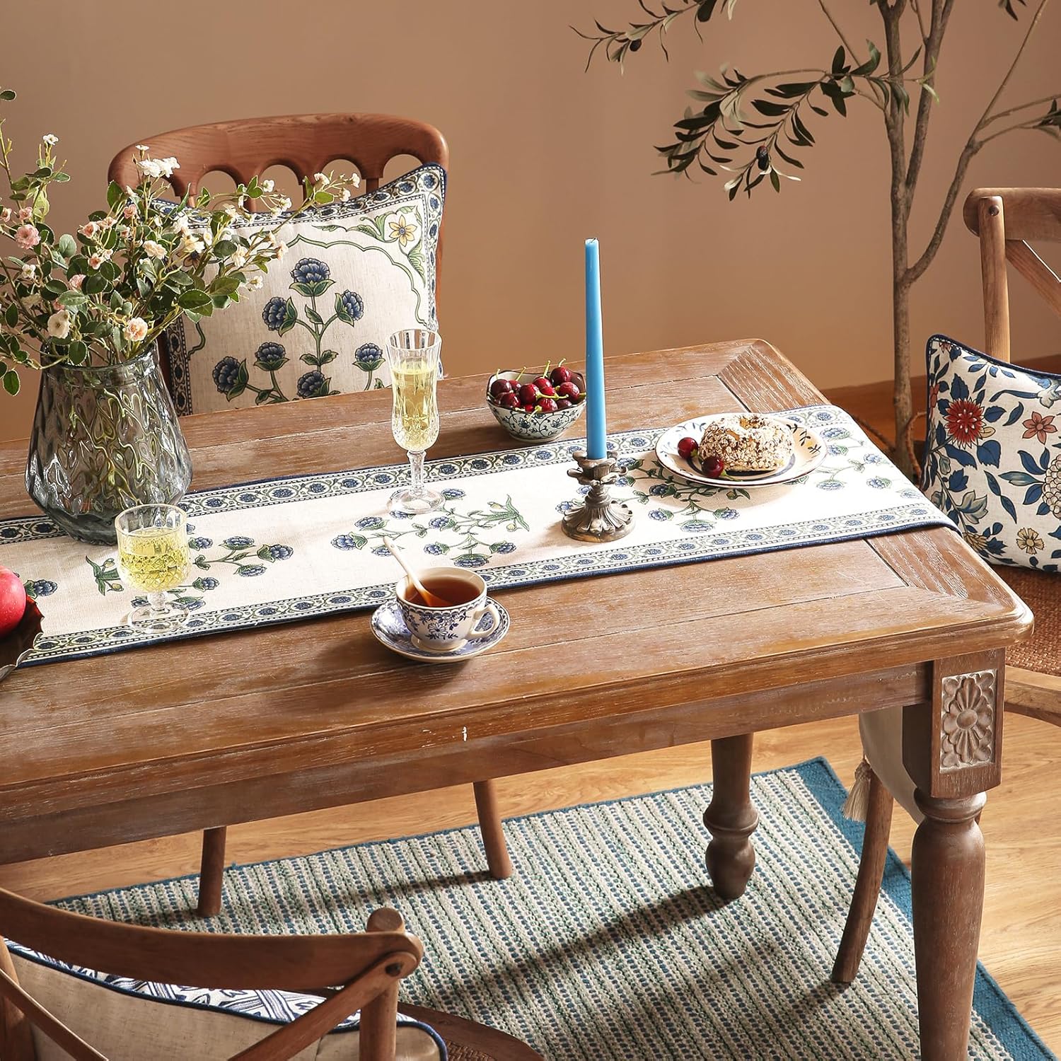 patdrea Designer Blue Rustic Elegant Floral Patterned Linen Table Runner 71 Inch Long,Wrinkle Resistant Table Mat,Decoration for Kitchen Dining and Coffee Tables Banquet Christmas , 12"x71"
