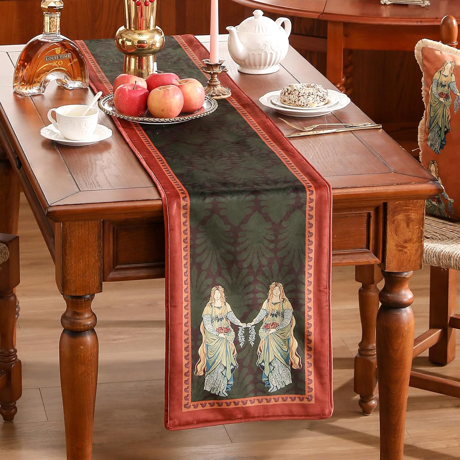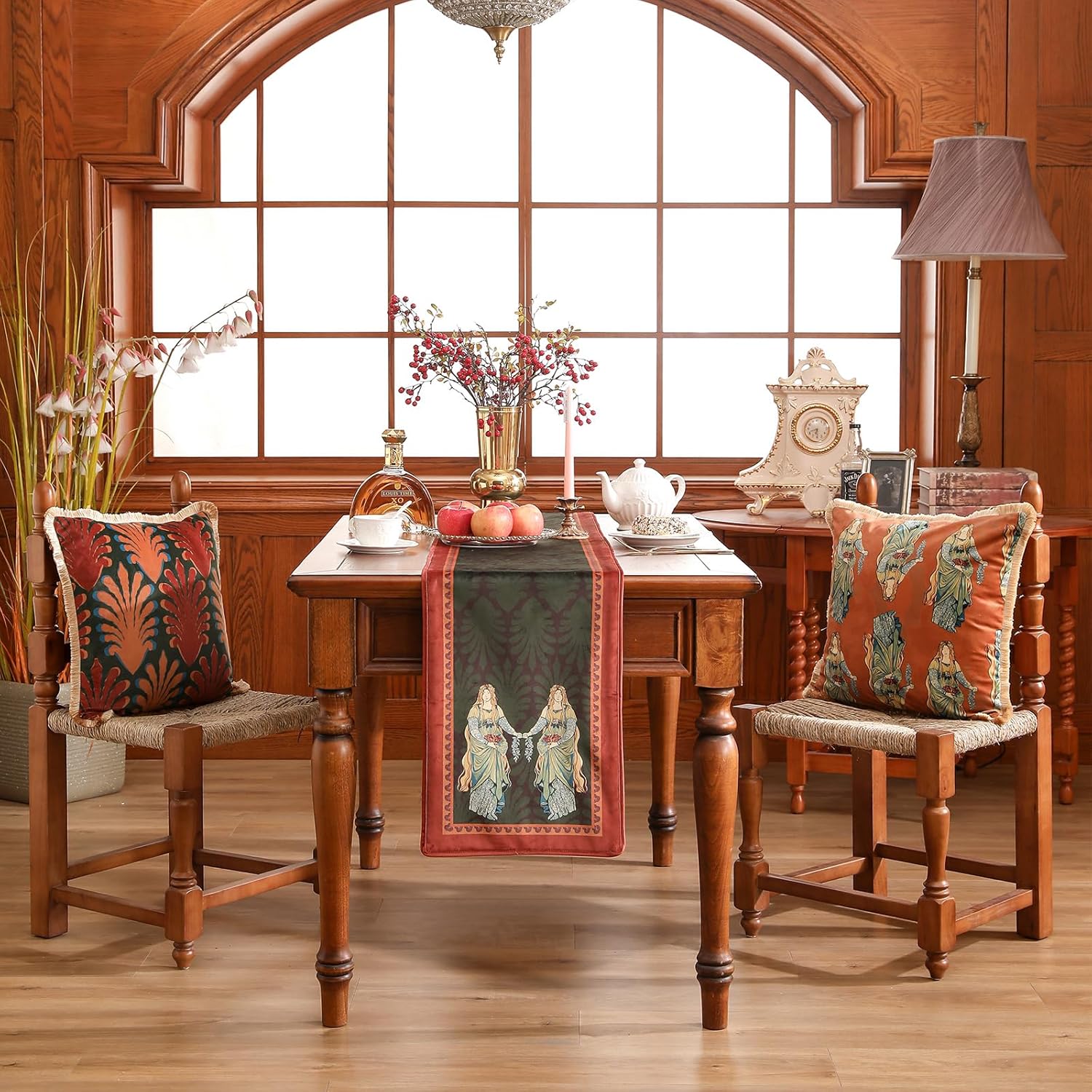 patdrea Designer Mysterious Oil Painting Figures Velvet Table Runner, Brown Green with Palm Frond Pattern Table Mat, Decoration for Kitchen Dining Coffee Table Cabinet Banquet Thanksgiving,12"*102"