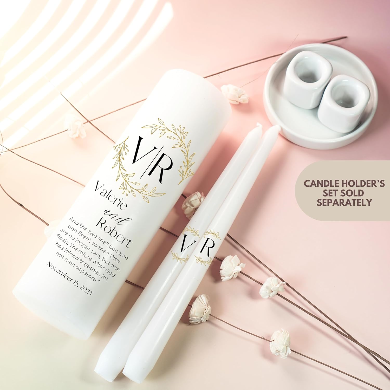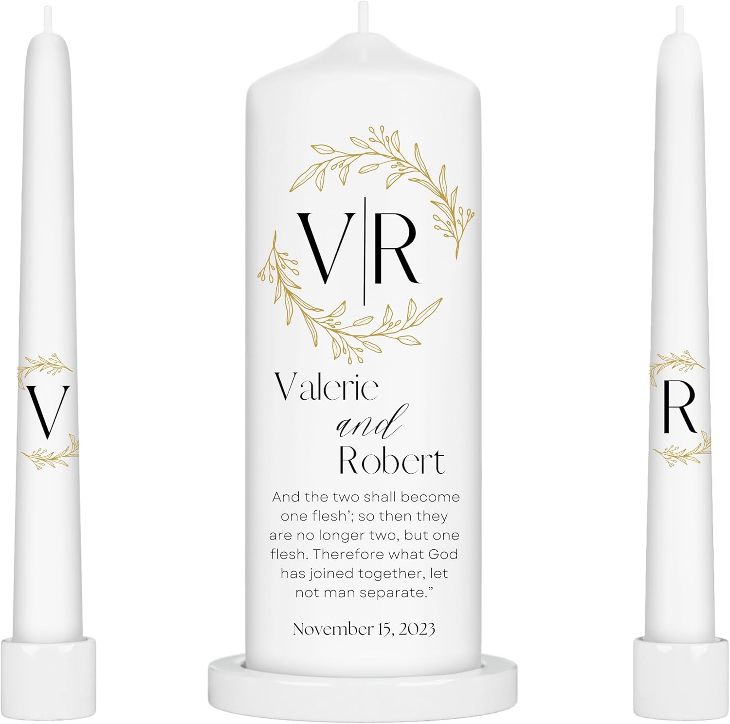 Unity Candles for Wedding, Modern Unity Set, Custom and Personalized Pillar and Taper Candles with Bible Quote, Unscented White Premium Wax, Religious and Wedding Ceremony, Special Events (Laurel)